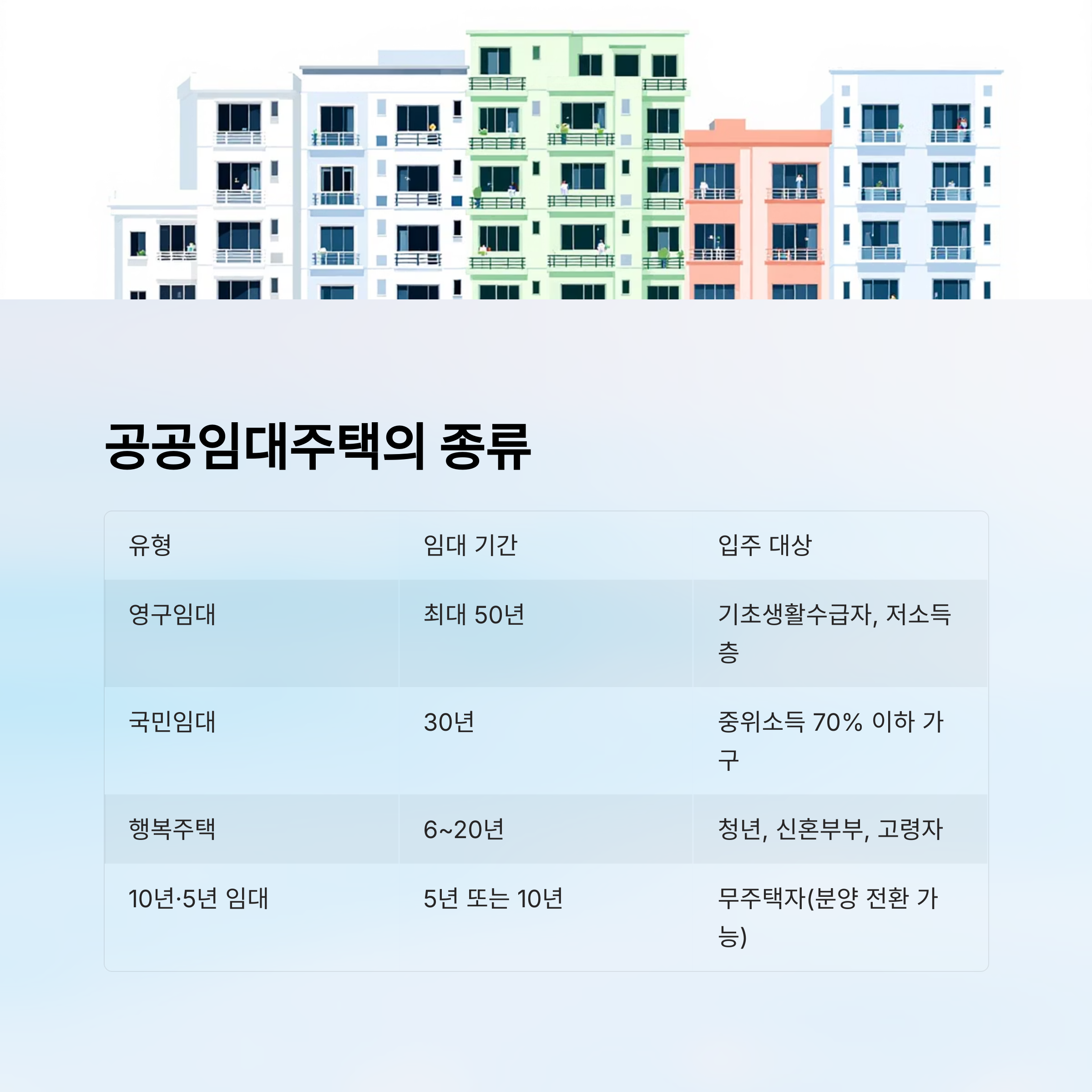 📌 **공공임대주택은 다양한 유형**으로 나뉘어요. 거주 가능 기간, 임대료, 입주 대상에 따라 **맞춤형 임대주택**을 선택할 수 있어요! 🏠✨
