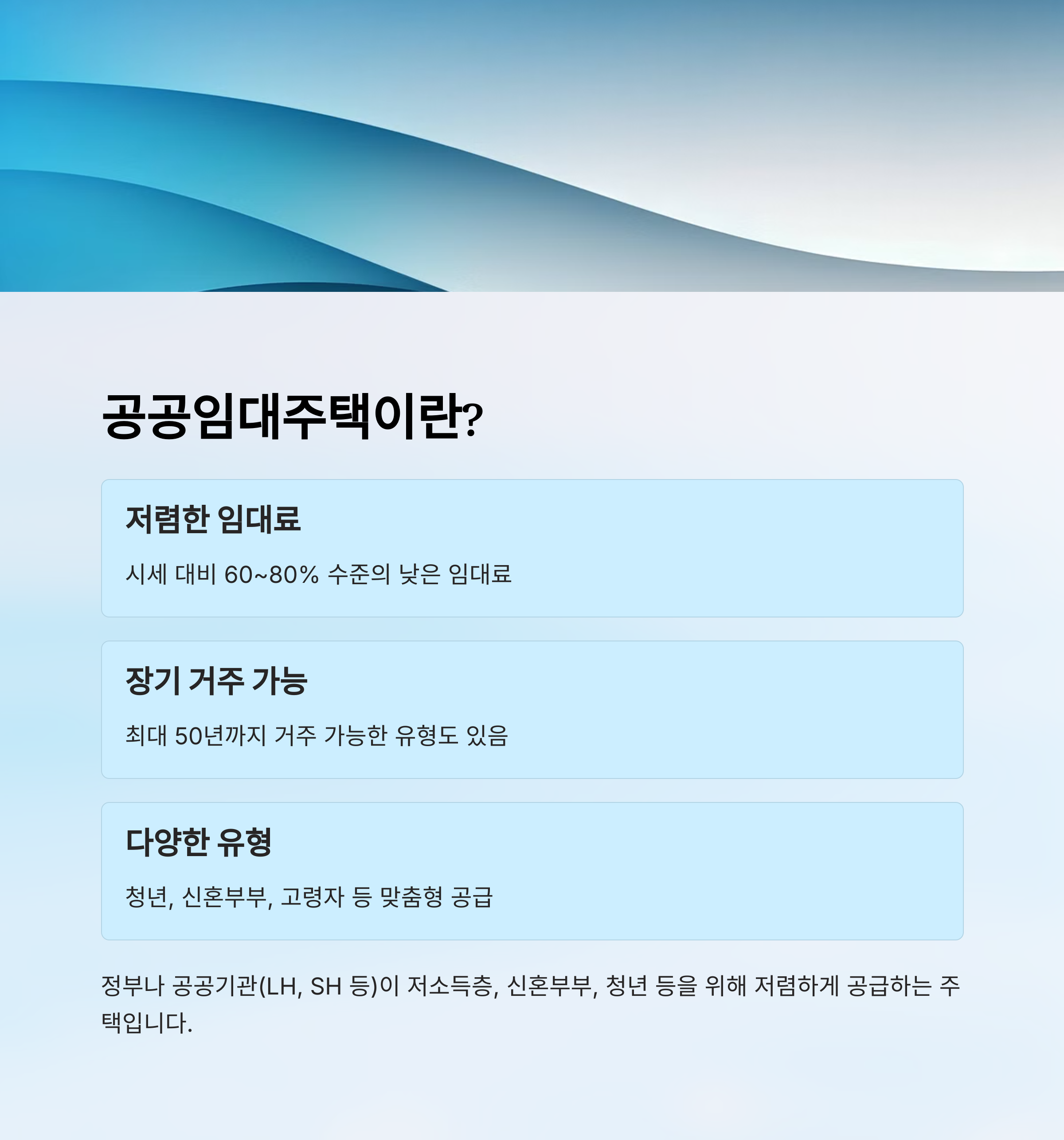 📌 **공공임대주택**은 정부나 공공기관(LH, SH 등)이 저소득층, 신혼부부, 청년 등을 위해 **저렴한 임대료로 공급하는 주택**이에요.