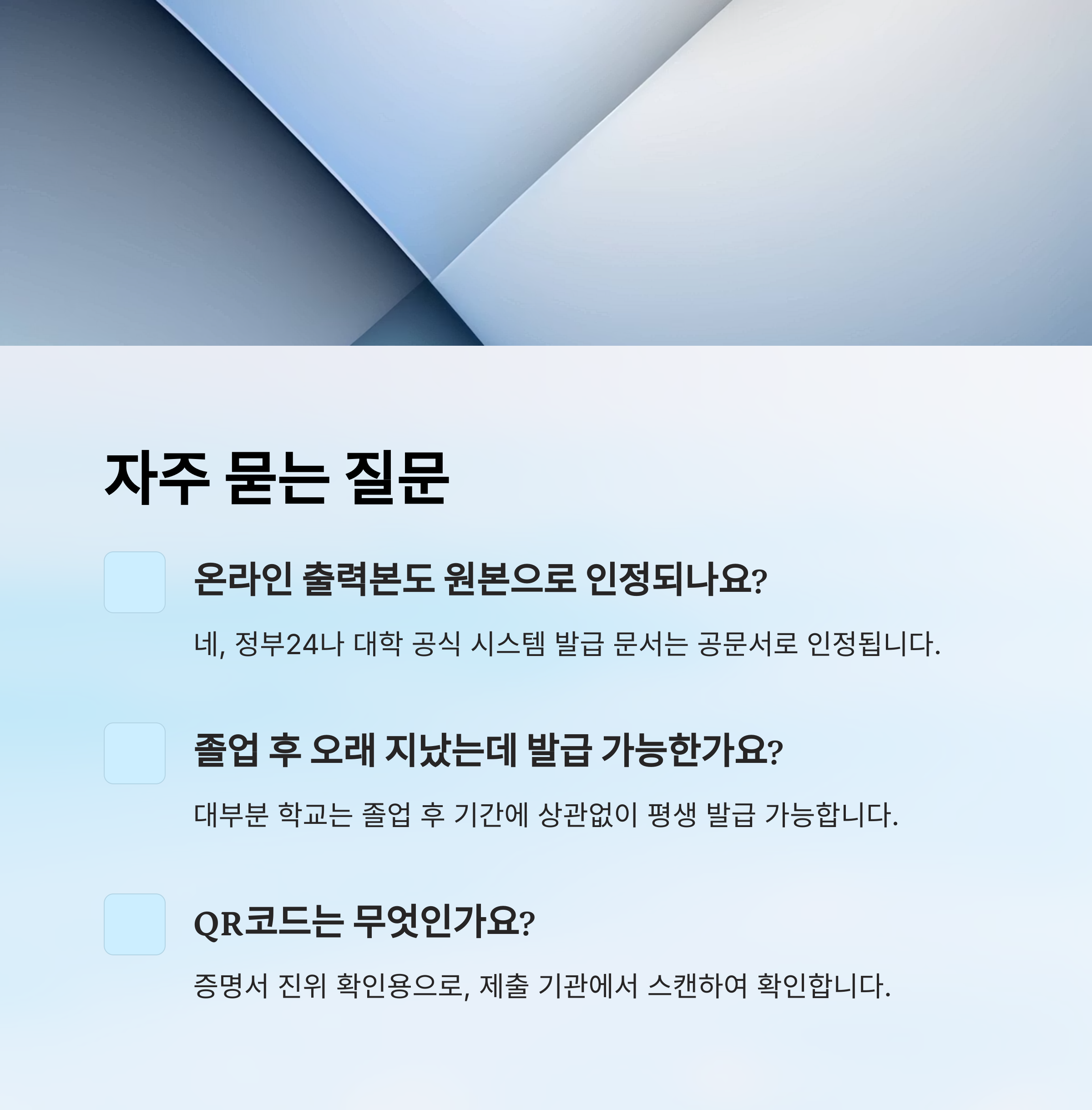 A5. QR코드는 진위 확인용이에요. 제출 기관에서 스캔하면 진짜인지 바로 확인할 수 있어요.