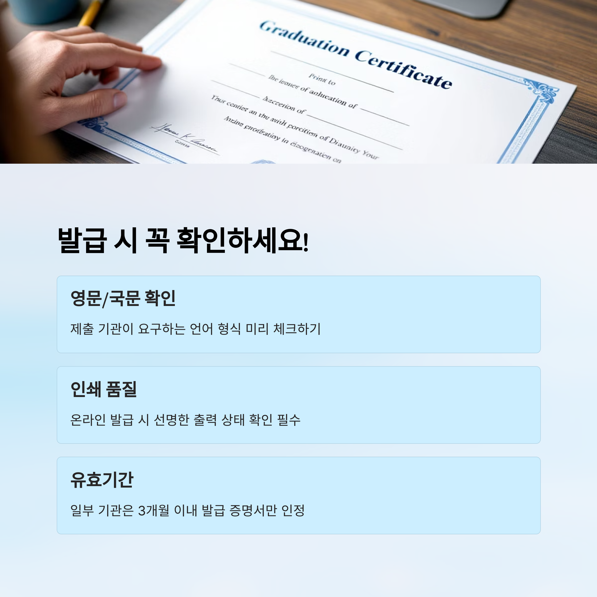 증명서 발급 시 몇 가지 주의해야 할 점이 있어요. 이를 잘 알고 있으면 불필요한 재발급을 피할 수 있고, 제출기관에서도 문제 없이 통과될 수 있어요. ✅