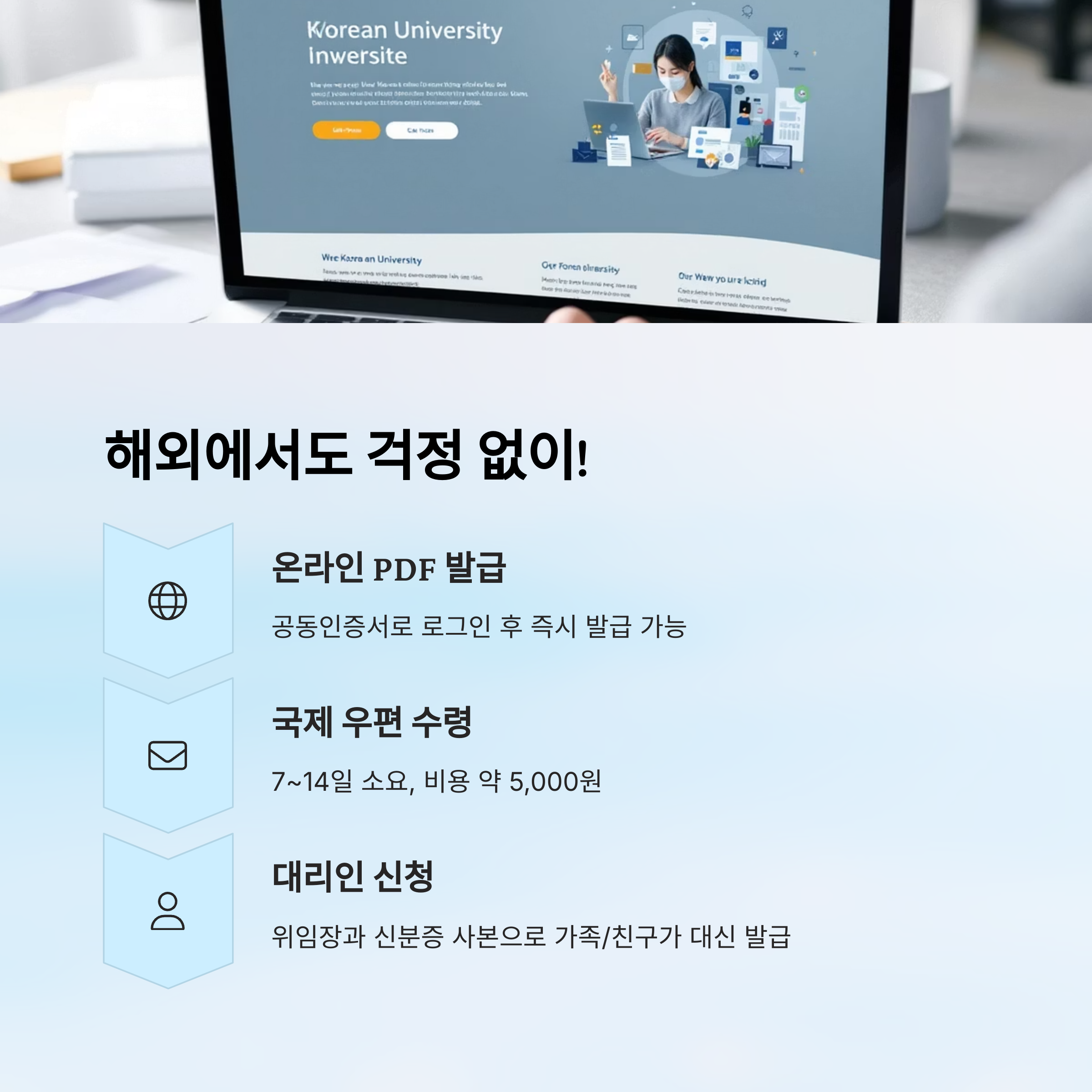 | 증명서발급 대행(예: 스마트증명) | 제휴 대학만 가능 | 로그인+본인 인증 | 출력/우편 |