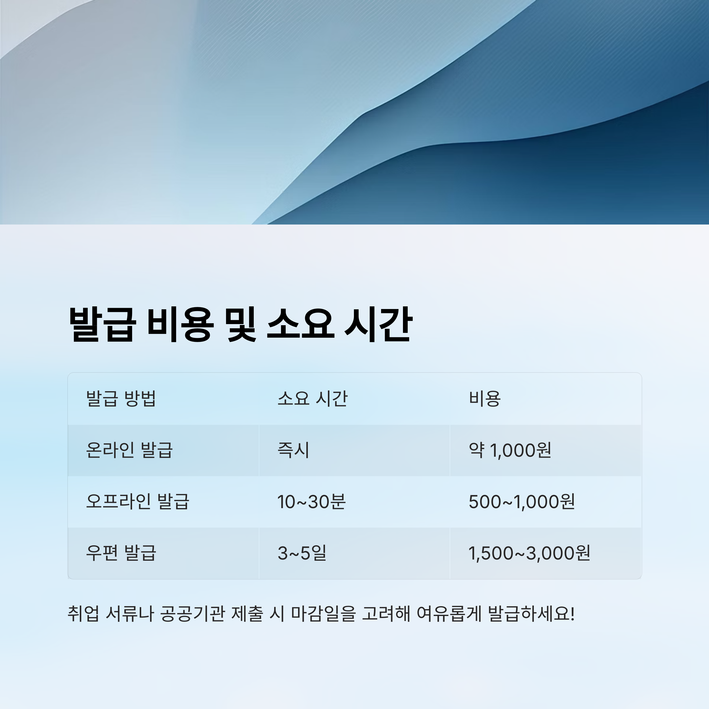 특히 취업 서류나 공공기관 제출 서류는 제출 마감일이 정해져 있는 경우가 많기 때문에 발급 일정을 여유롭게 잡는 것이 좋아요.