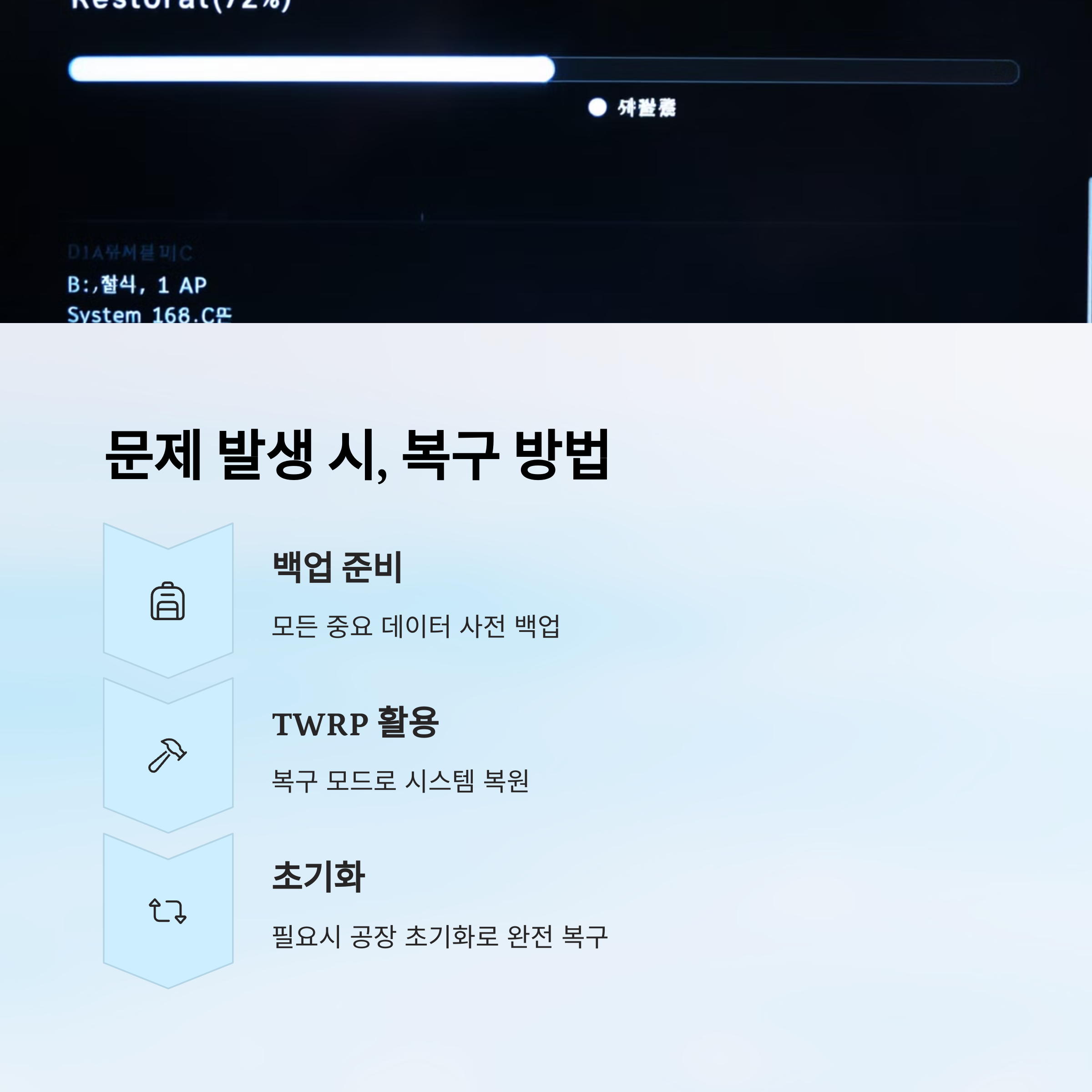 A6. 먼저 리커버리 모드로 진입해서 공장 초기화를 시도하거나, PC를 이용해 순정 펌웨어를 재설치해보세요. 백업이 없다면 데이터는 복구 어려울 수 있어요.