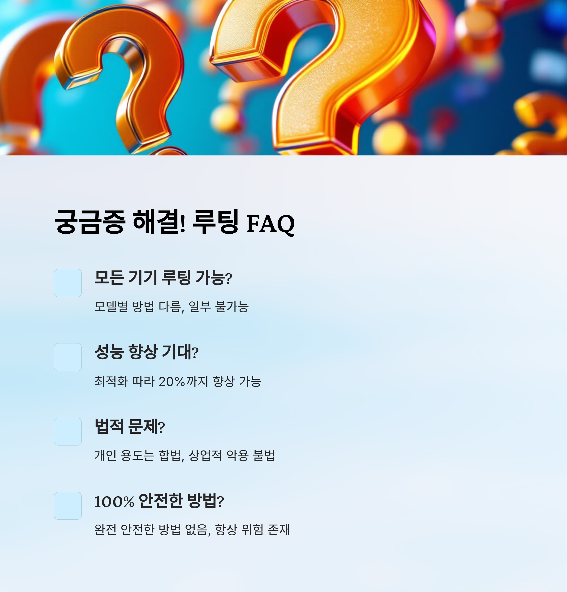 이제 루팅에 대해 거의 다 알아봤어요! 그럼 마지막으로, 자주 묻는 질문들(FAQ) 정리해드릴게요. 한눈에 쏙쏙 들어오도록 준비했어요 💡