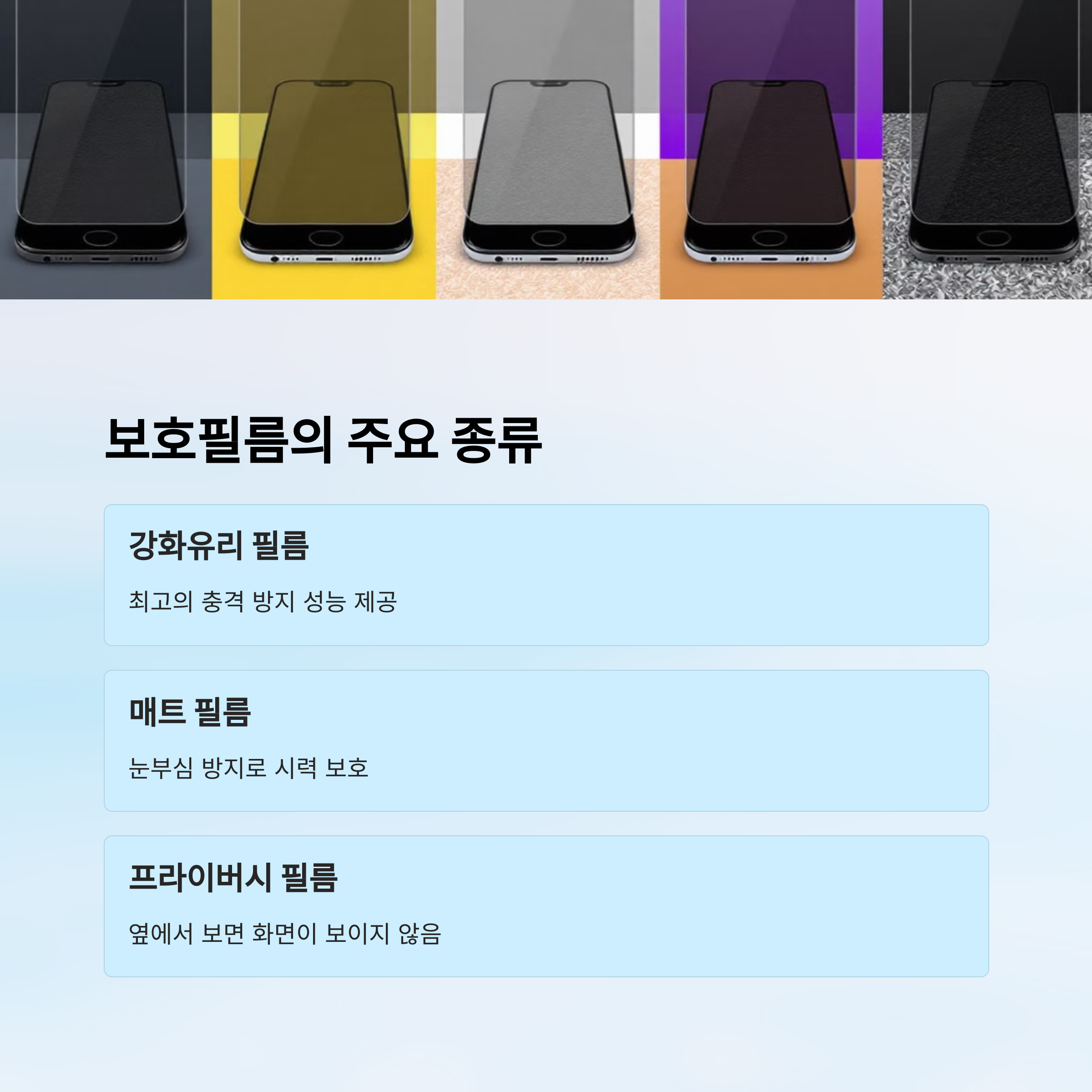 이처럼 보호필름은 단순히 액정을 보호하는 수준을 넘어서 다양한 생활 편의 기능까지 제공하는 스마트한 액세서리로 진화했어요. 다음 파트에서는 어떤 종류들이 있는지, 각각 어떤 특색이 있는지 자세히 소개할게요! 📱✨