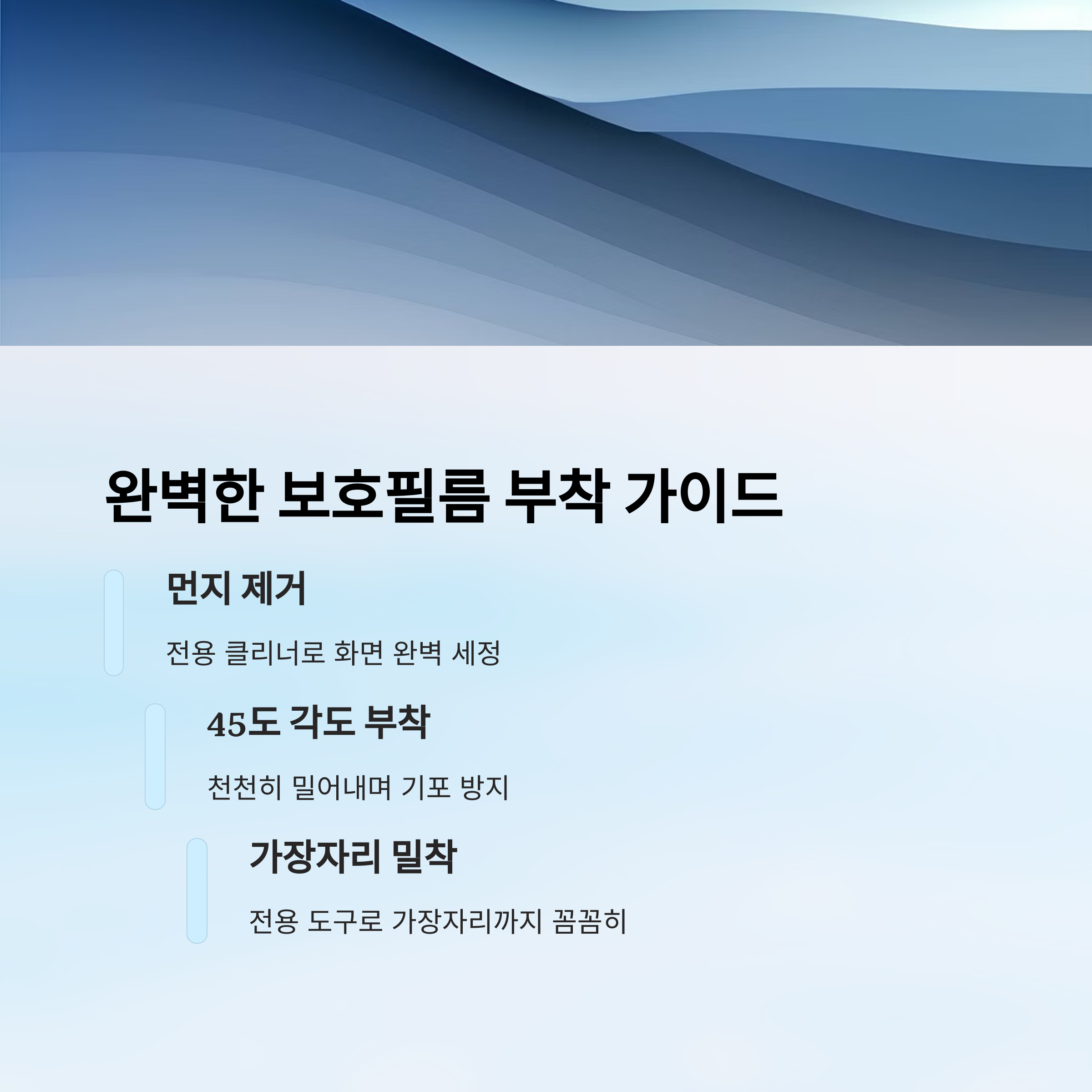 보호필름은 아무리 좋은 걸 사도 부착을 잘못하면 말짱 도루묵이에요. 기포가 들어가거나 먼지가 들어가면 보기 싫을 뿐만 아니라 터치감도 나빠지고, 결국 다시 교체하게 되죠. 그래서 부착 전 준비부터 천천히 꼼꼼하게 하는 게 가장 중요해요 💡