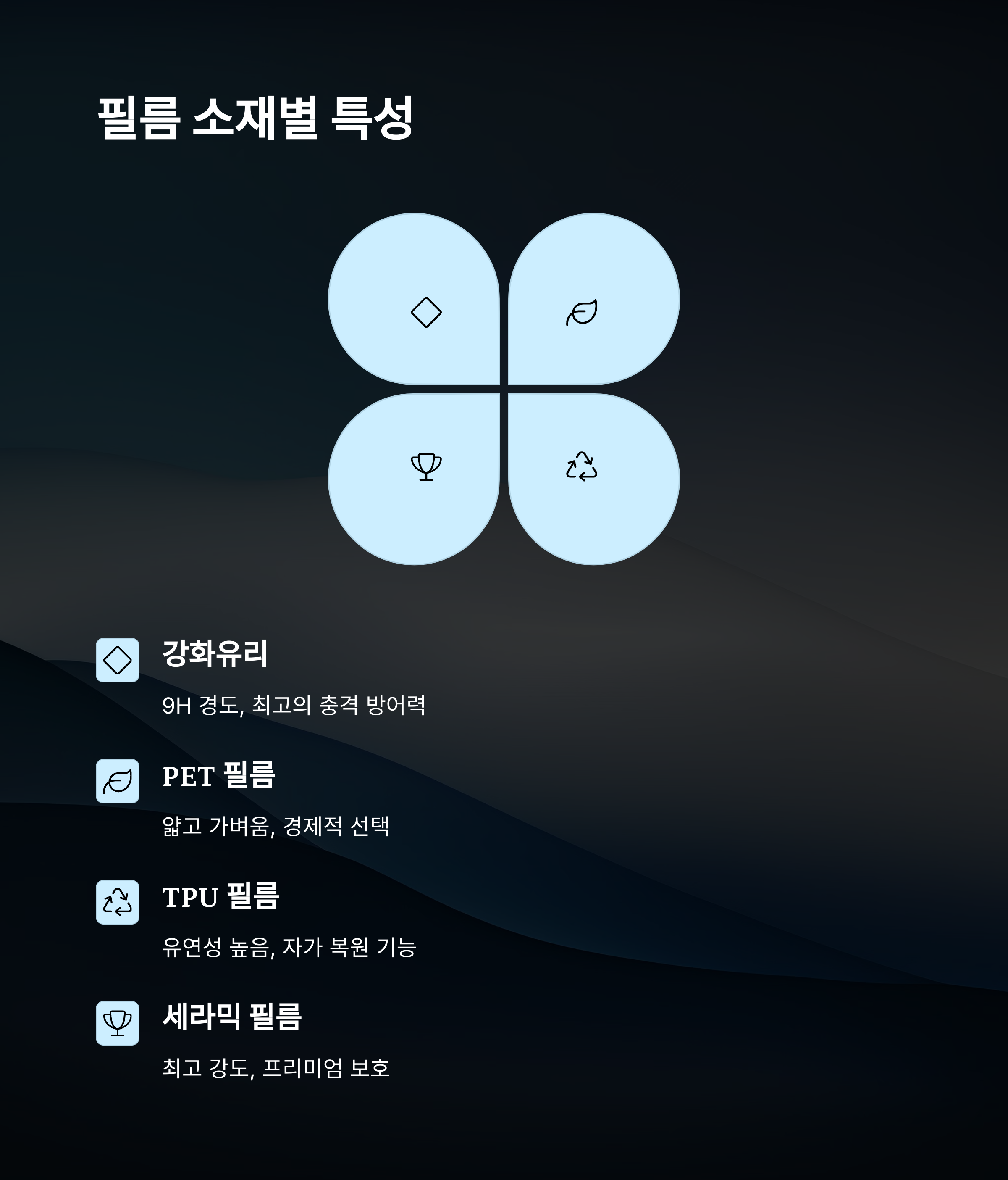 스마트폰 보호필름은 우리가 생각하는 것보다 훨씬 다양한 종류가 있어요. 겉보기엔 비슷해 보여도 소재와 두께, 기능에 따라 완전히 다른 사용감을 제공하거든요. 기본적으로는 PET, TPU, 강화유리, 하이드로겔, 프라이버시 필름 등으로 나눌 수 있어요.