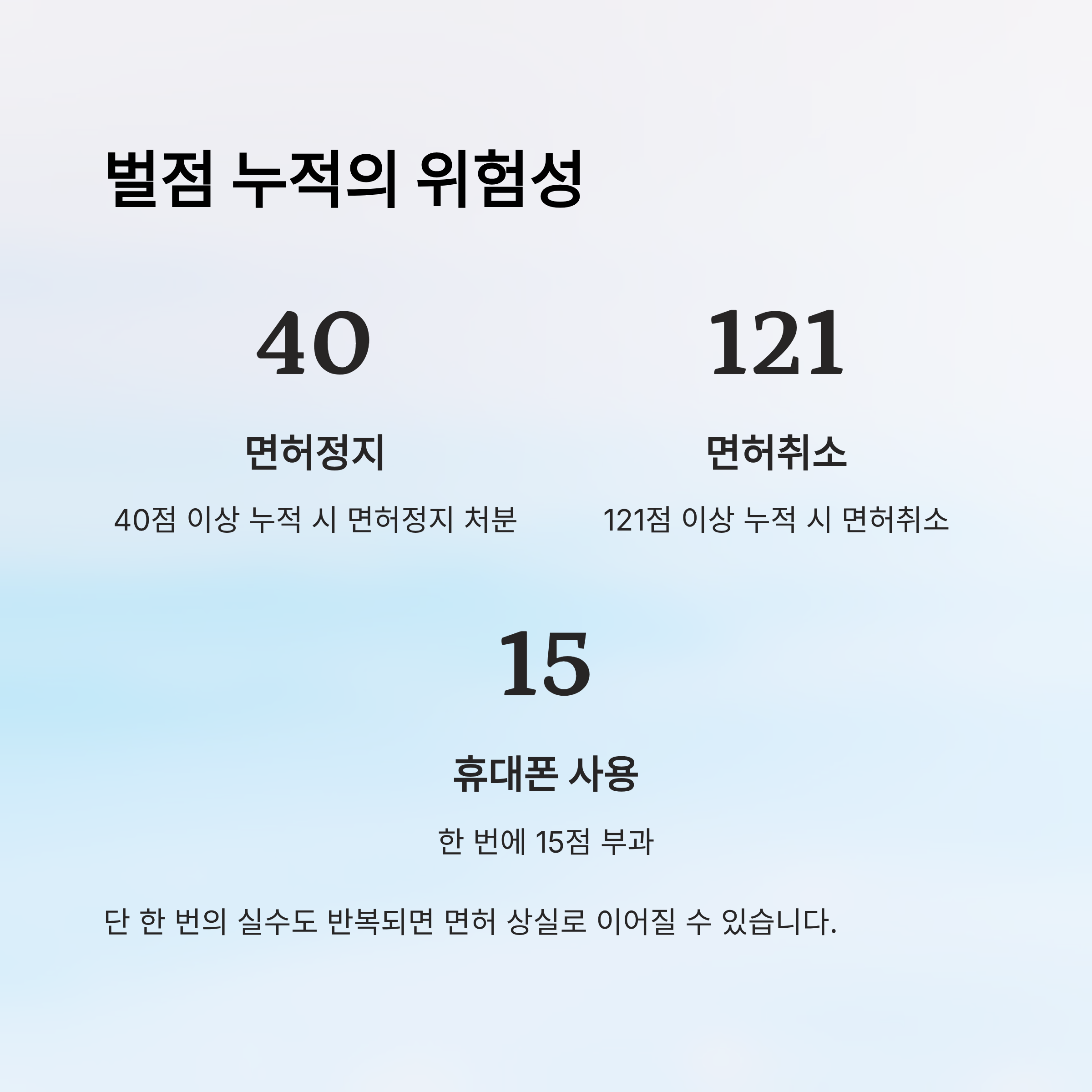 벌점은 누적될수록 위험해요. 40점 이상이면 면허정지, 121점 이상이면 면허취소가 될 수 있거든요. 그래서 단 한 번의 실수라도 반복되면 큰 불이익이 돌아올 수 있어요.