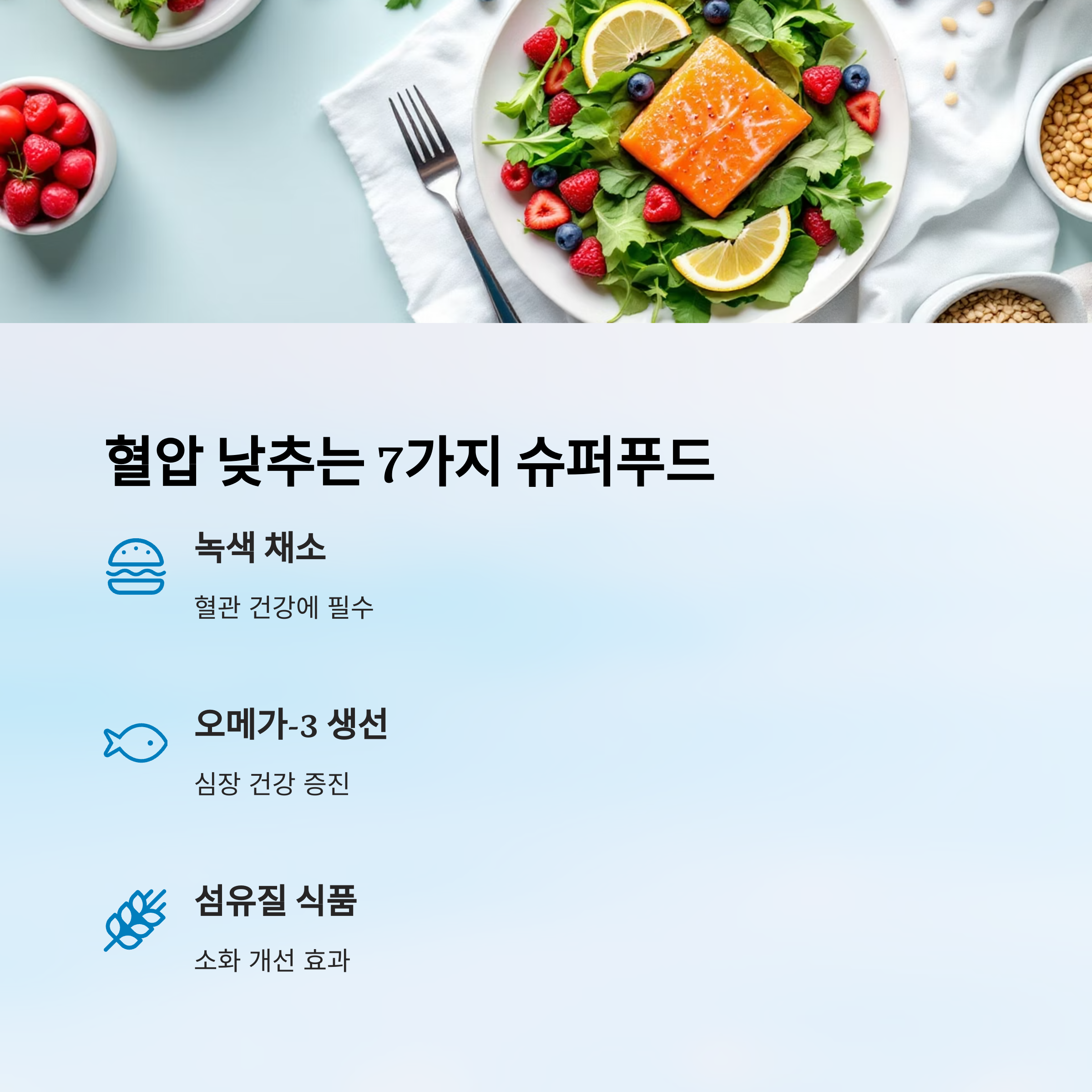 | 오메가-3 | 혈관 건강을 유지하고 혈압 조절 | 연어, 고등어, 아마씨 |