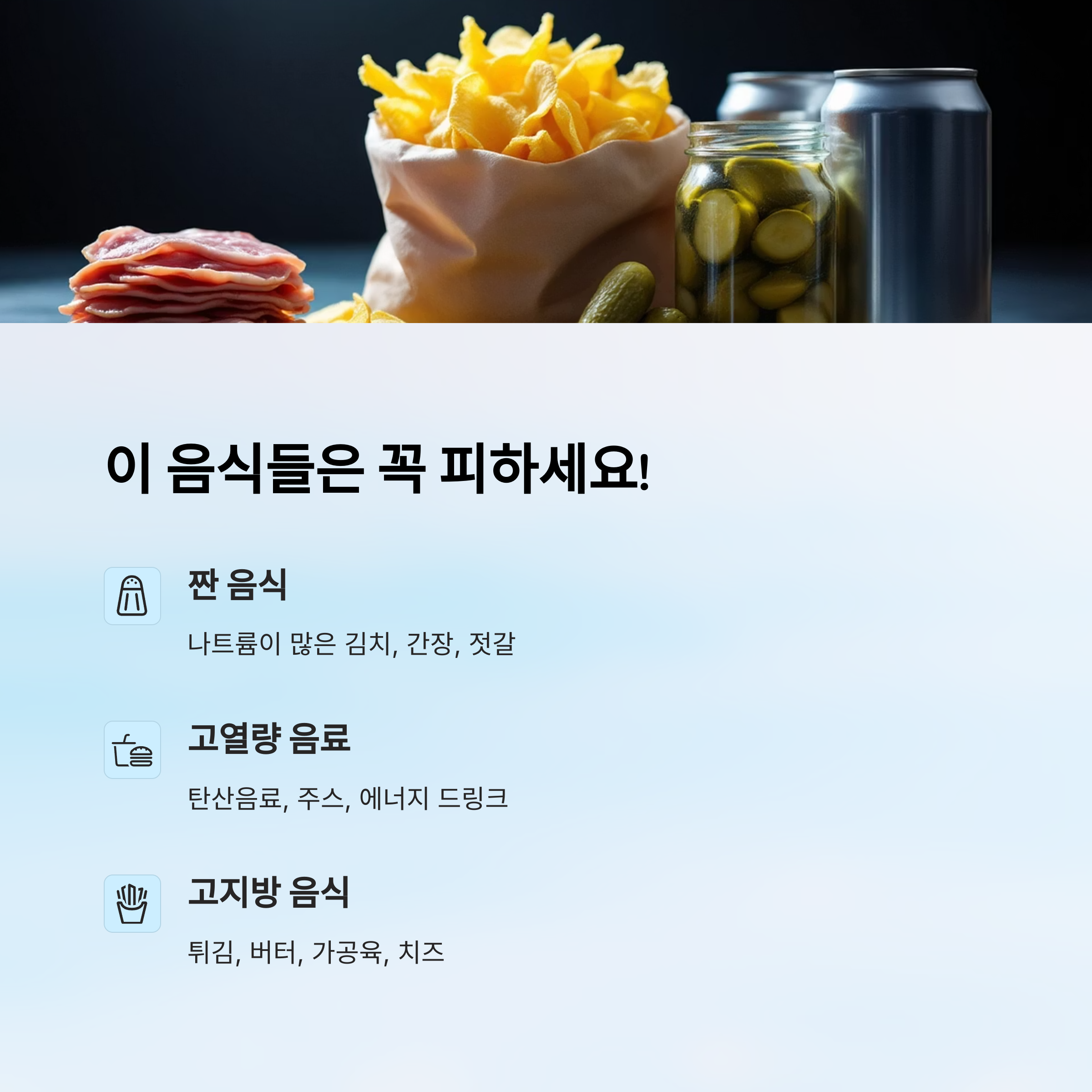 고혈압을 관리하려면 나트륨, 포화지방, 설탕이 많은 음식을 피해야 해요. 이런 음식들은 혈압을 급격히 상승시키거나 혈관 건강을 해칠 수 있어요. 😥