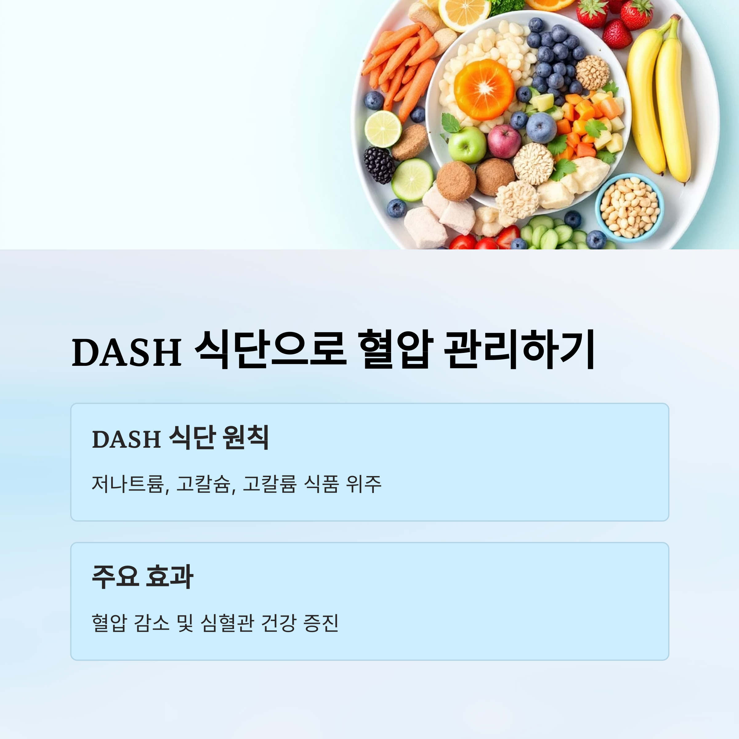 DASH(Dietary Approaches to Stop Hypertension) 식단은 고혈압 예방과 관리에 효과적인 식이요법이에요. 나트륨 섭취를 줄이고 칼륨, 마그네슘, 섬유질이 풍부한 식품을 섭취하는 것이 핵심이에요! 🥗