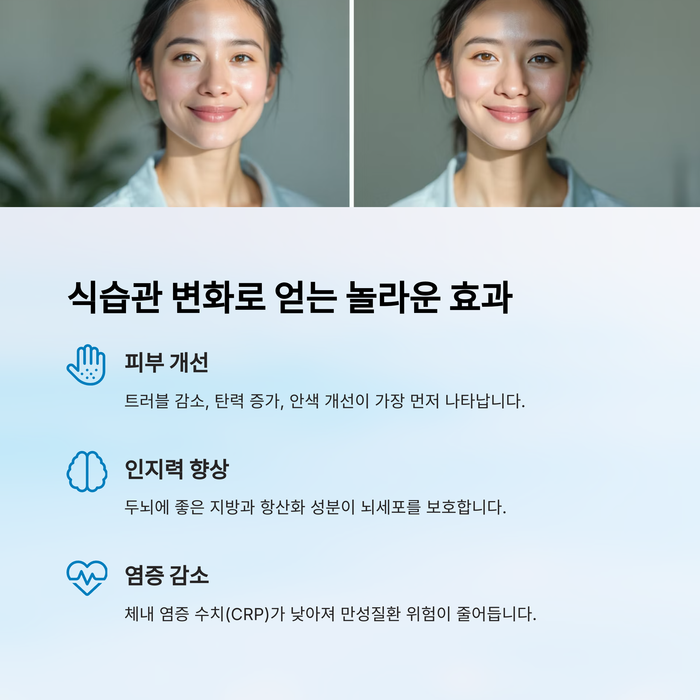 꾸준히 실천하면 피부에 변화가 가장 먼저 나타나요. 트러블이 줄고 탄력도 생기며, 안색이 환해져요. 많은 사람들이 이 부분에서 가장 만족을 느끼더라고요.