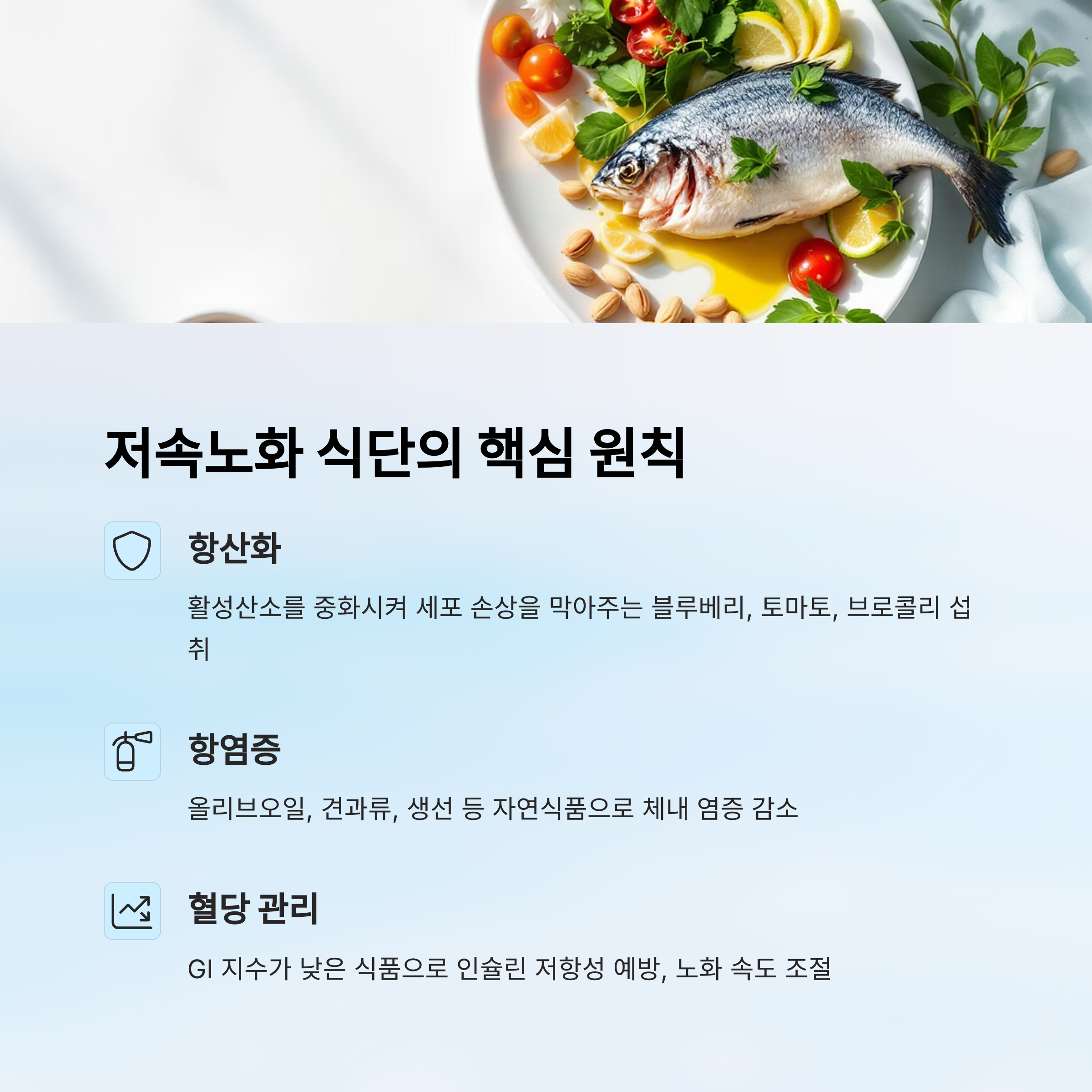 저속노화 식단의 핵심은 단순해요. '항산화, 항염증, 영양밀도' 이 세 가지 키워드만 기억하면 돼요. 이 원칙들은 모두 세포가 늙는 걸 막아주고, 몸속 염증을 억제해서 건강한 상태를 오래 유지하게 도와준답니다.