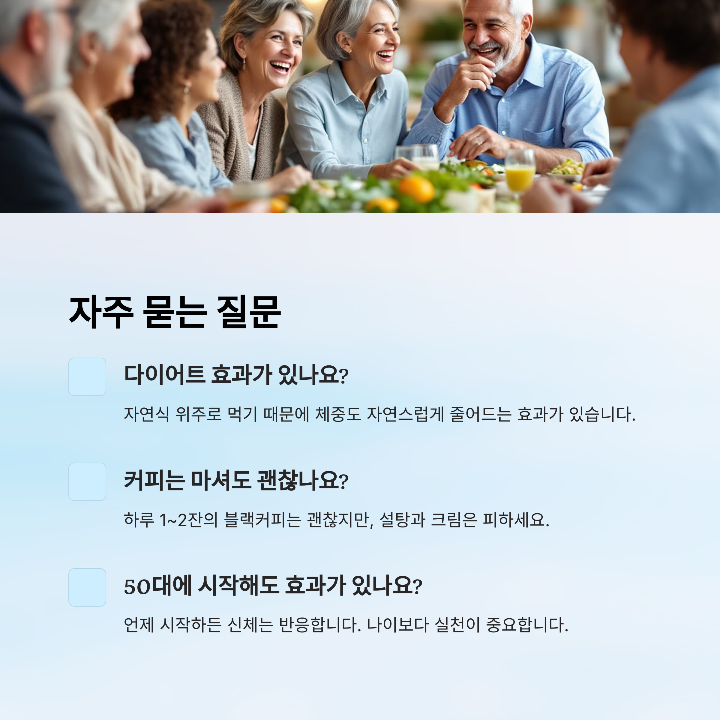 A8. 자연식 위주 식단이기 때문에 부작용은 거의 없고, 오히려 전반적인 건강이 향상돼요.
