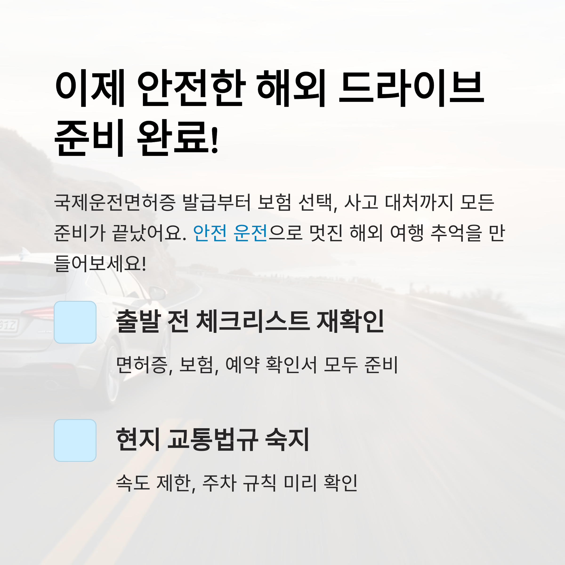 이 표만 잘 참고해도 나라별 렌트 조건을 한눈에 파악할 수 있어요. 이제 국제운전면허증 발급부터, 렌트 예약, 보험 선택, 사고 대처, 국가별 조건까지 다 알아봤으니 남은 건 실제 여행에서 안전하게 운전하는 것뿐이에요! 🎯