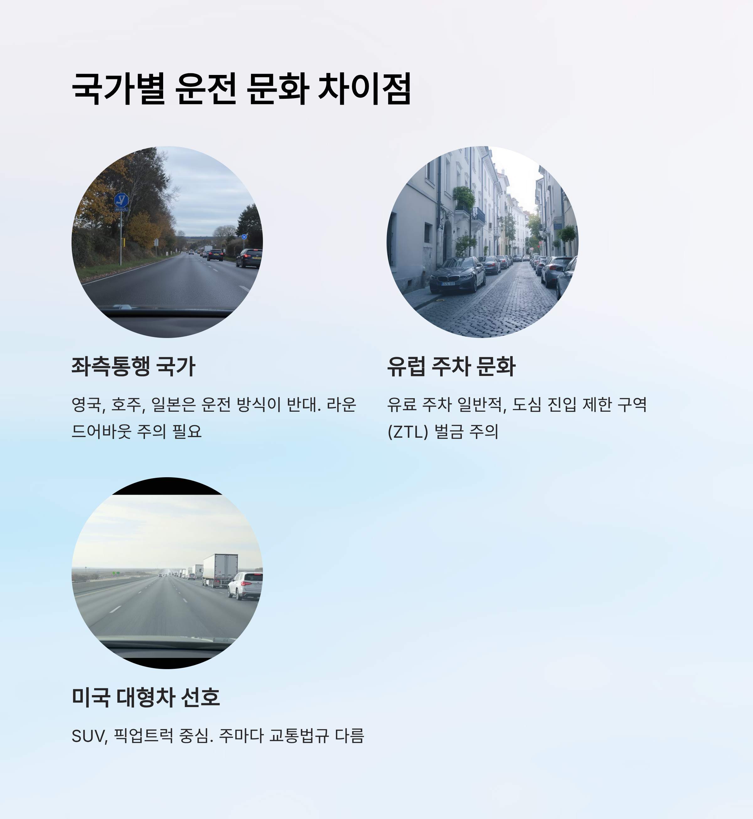 이제 준비물 걱정은 끝! 다음 섹션에서는 진짜 실전편, 해외에서 렌트카 예약하고 직접 운전할 때 주의할 점들을 아주 꼼꼼하게 알려줄게요! 특히, 국가별 운전 문화 차이까지 다루니까 기대해도 좋아요 🌎