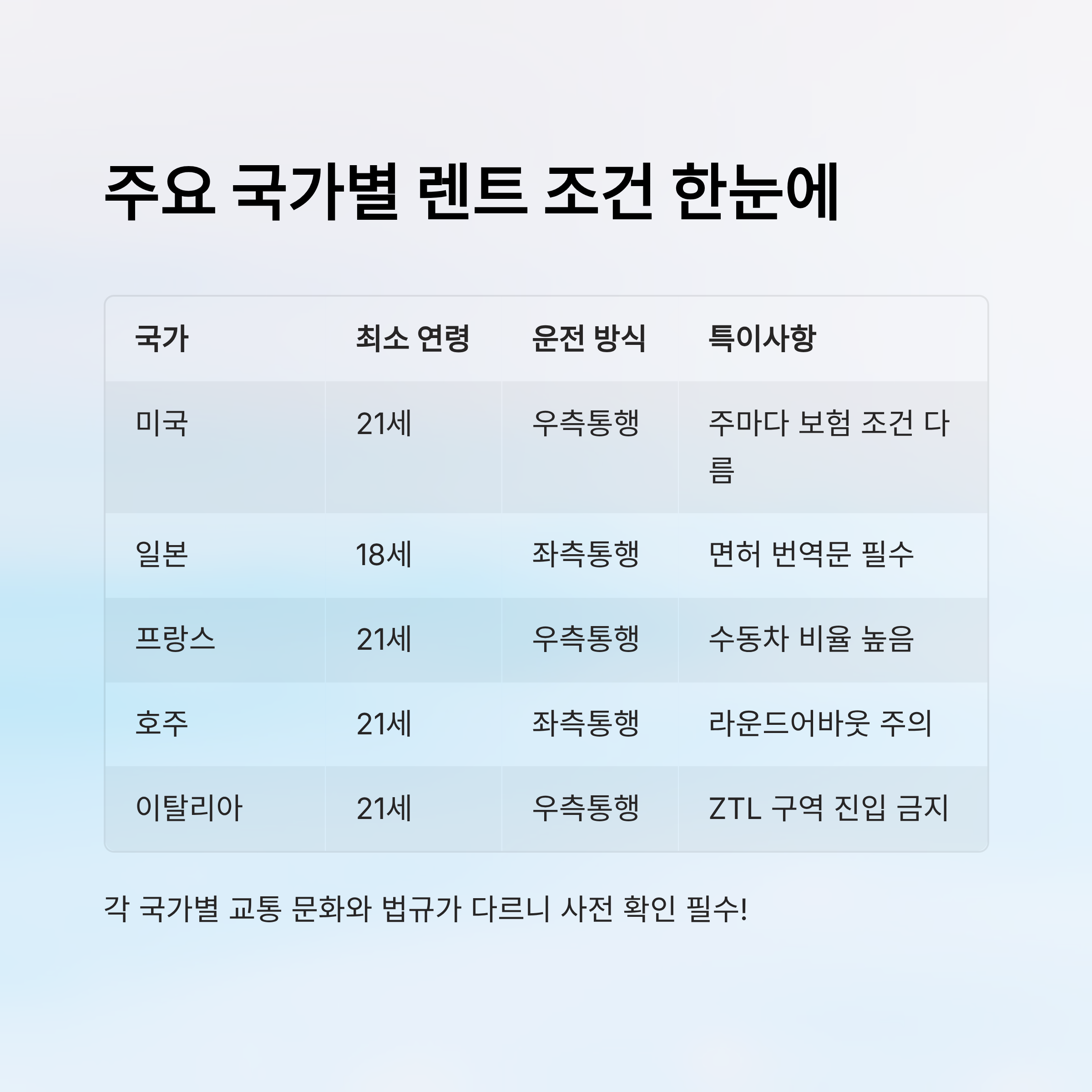 해외에서 렌트카를 이용하려면 그 나라의 렌트 조건을 미리 파악해두는 게 좋아요. 나라별로 요구하는 운전경력, 나이, 보험 조건, 필수 서류, 통행 방식 등이 모두 달라요. 특히 같은 유럽 국가라도 프랑스와 독일의 렌트 조건은 전혀 다르기 때문에 사전 비교는 필수예요.