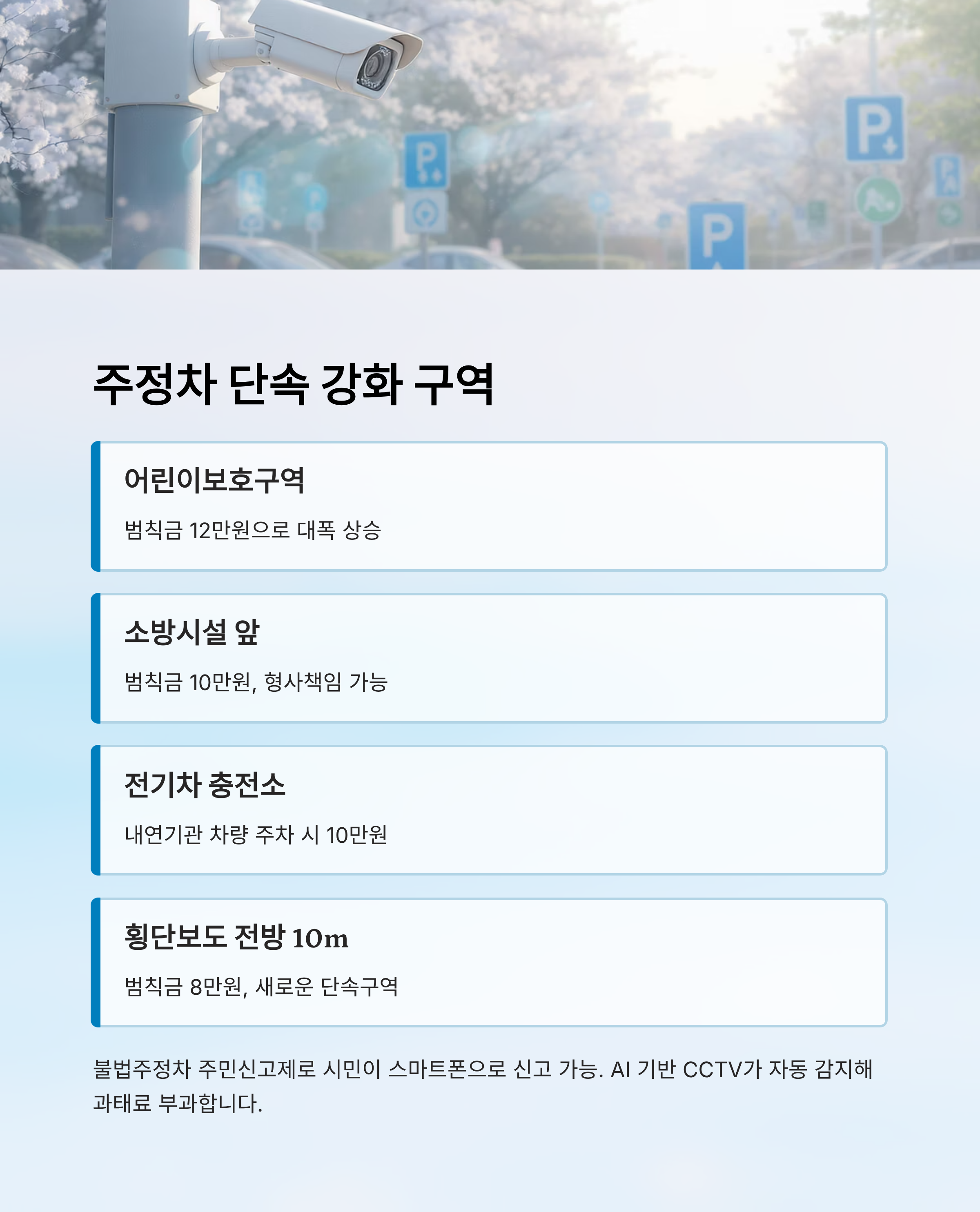 어린이보호구역, 소방시설 주변, 횡단보도 인근, 전기차 충전소 등이 단속 강화 구역이에요. AI CCTV와 주민 신고제를 통해 단속이 엄격해졌어요.