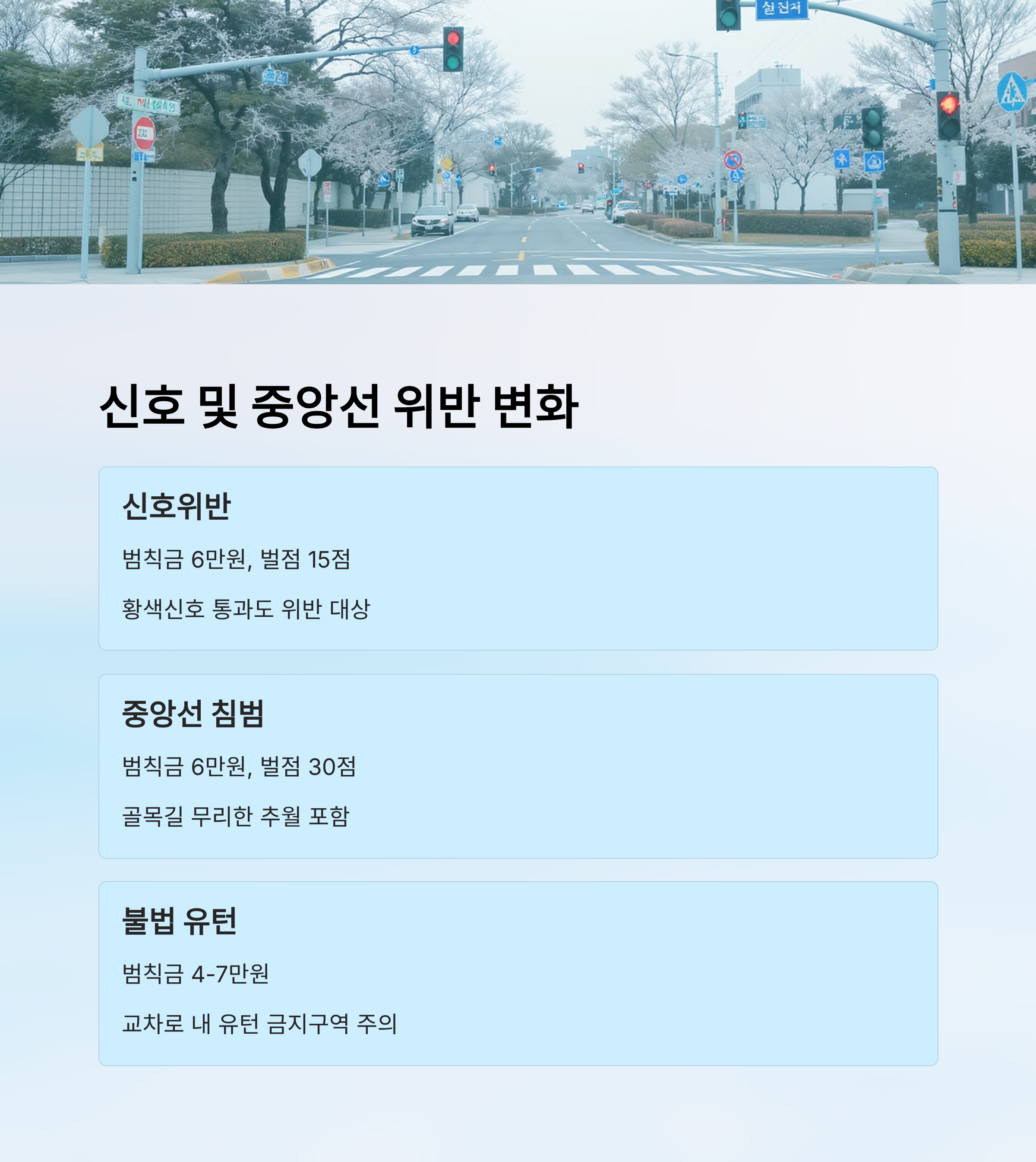신호위반은 기존과 동일하게 범칙금 6만 원과 벌점 15점이 부과되지만, 사고 유발 가능성이 높은 위치에서는 단속 강화 지점으로 지정돼 상시 단속이 이뤄지고 있어요. 특히 좌회전 시 황색신호 통과도 위반으로 간주돼 주의가 필요해요.