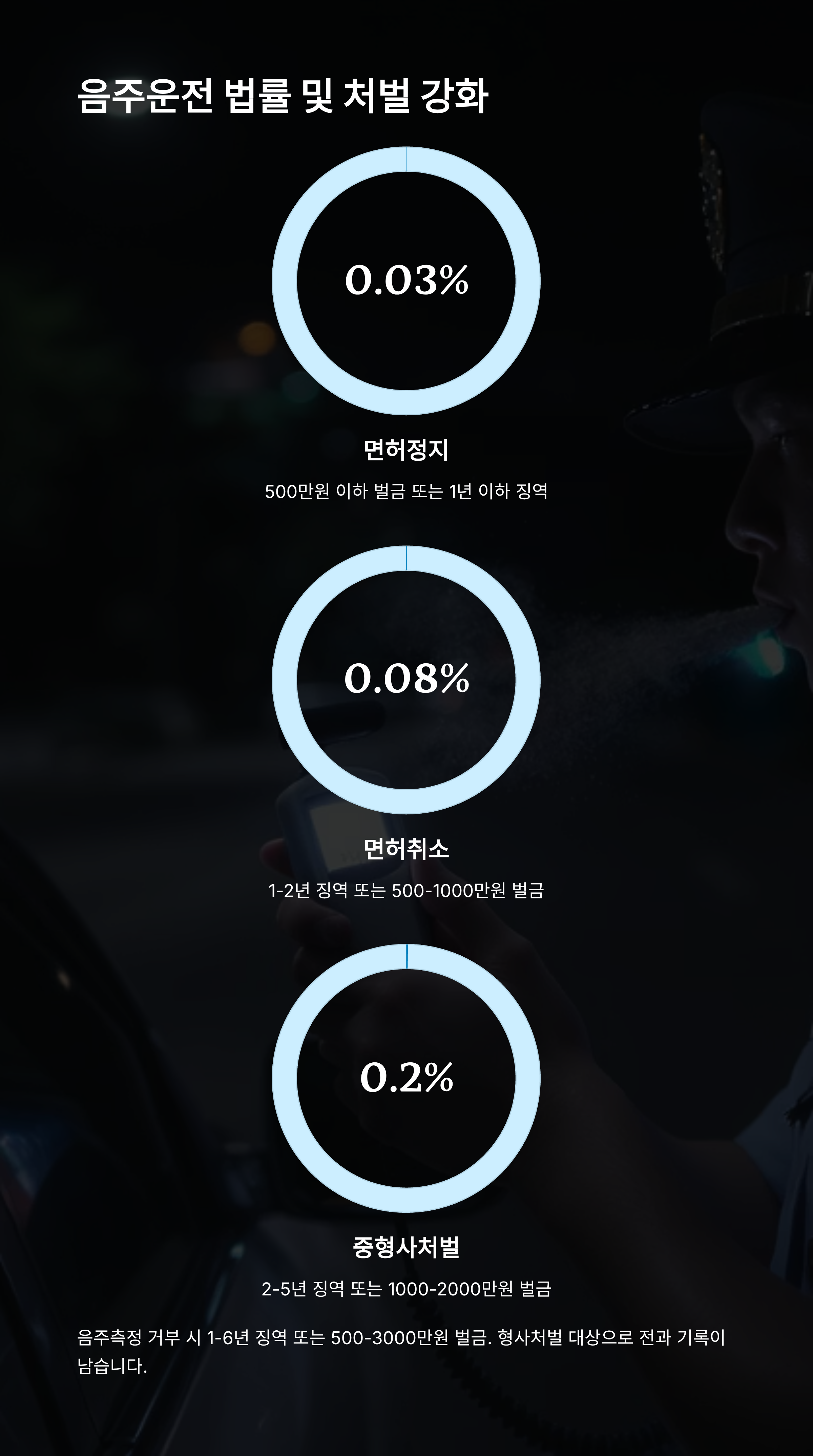 | 0.08~0.2% | 면허취소, 1년~2년 이하 징역 또는 500만~1,000만 원 벌금 | 형사처벌 |