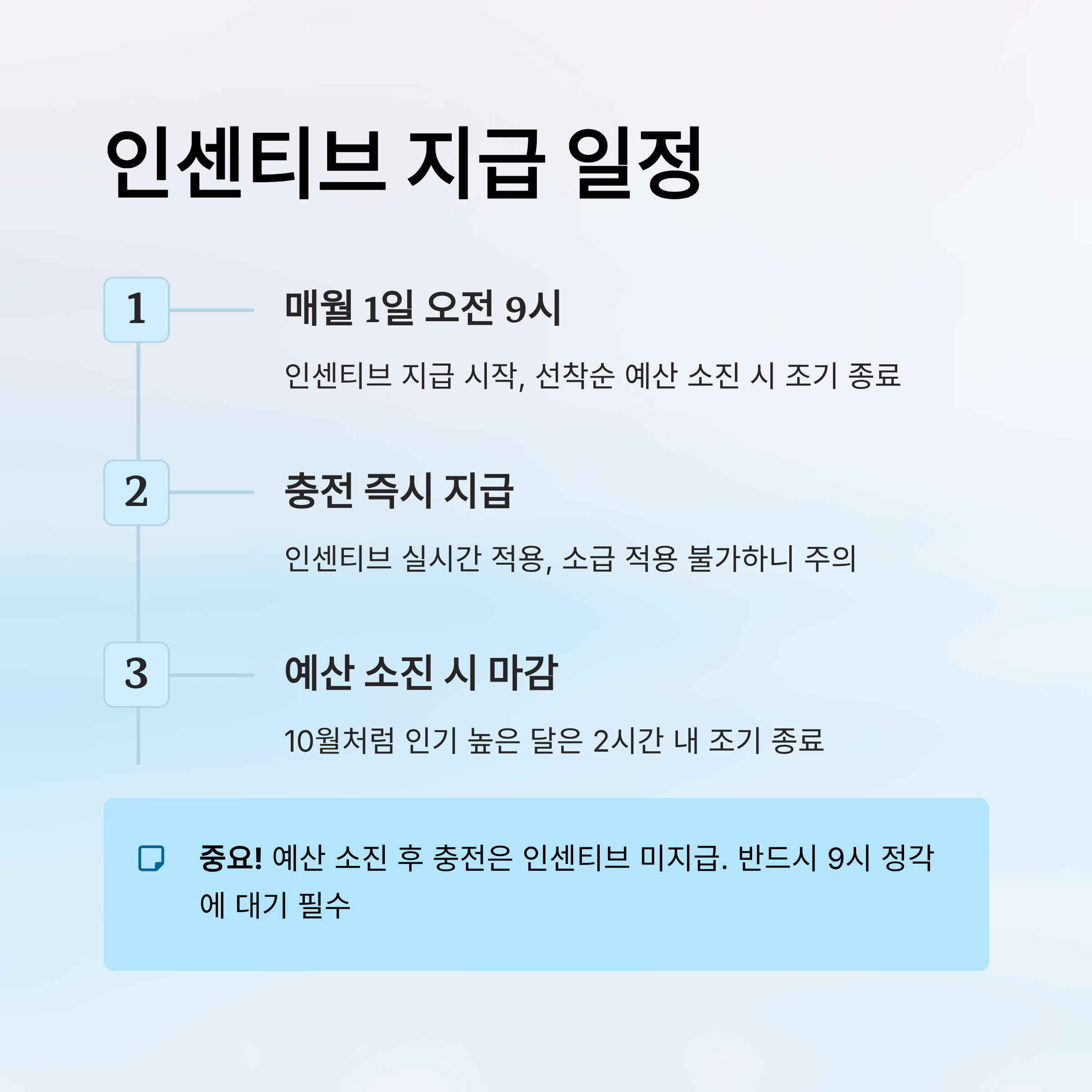 10월에는 명절이 포함되어 있기 때문에, 인센티브 지급일(10월 1일)은 특별히 신경 써야 하는 시기예요. 예산은 선착순으로 지급되기 때문에 앱에서 대기하고 있다가 9시 정각에 바로 충전하는 게 유리해요.⏳