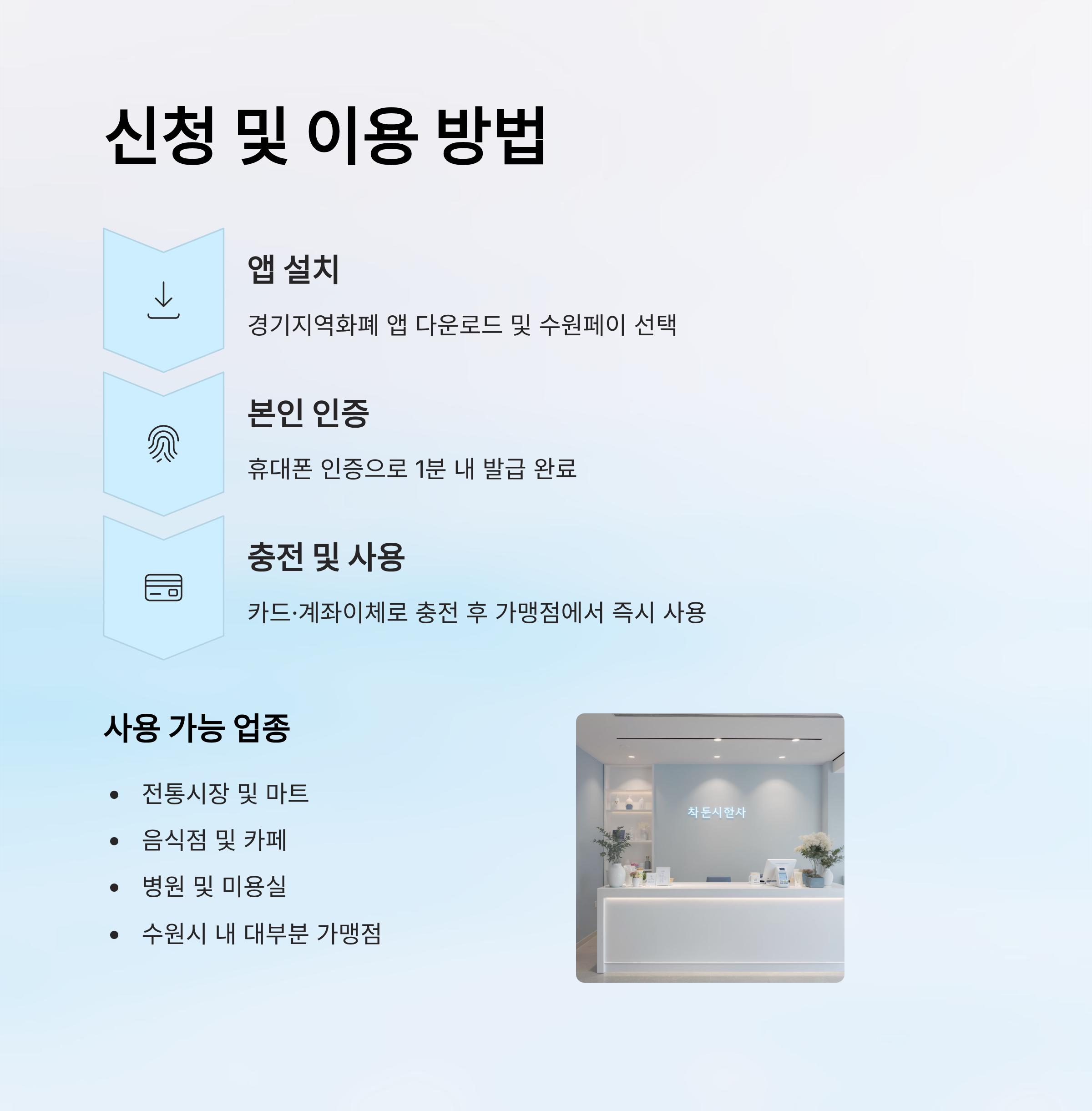 수원페이를 신청하고 사용하는 방법은 아주 간단해요. 경기지역화폐 앱만 설치하면 언제 어디서든 신청부터 충전, 사용까지 한 번에 끝낼 수 있답니다.📱