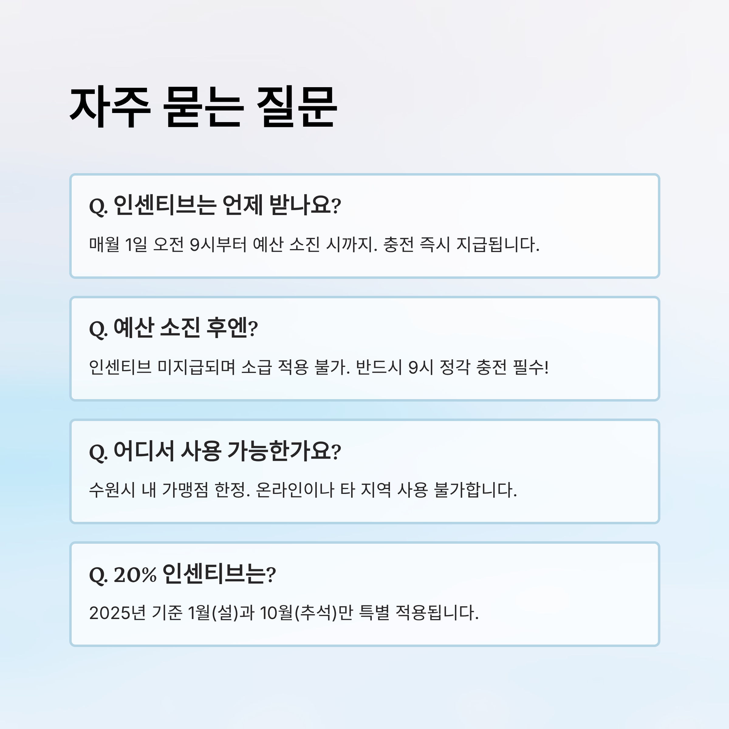 수원페이 인센티브 정책은 수원시 및 경기지역화폐 운영 방침에 따라 사전 예고 없이 변경될 수 있습니다. 본 글에 포함된 정보는 2025년 10월 2일 기준이며, 실시간 정책 변동은 수원시청 또는 경기지역화폐 공식 홈페이지를 통해 확인해주세요.