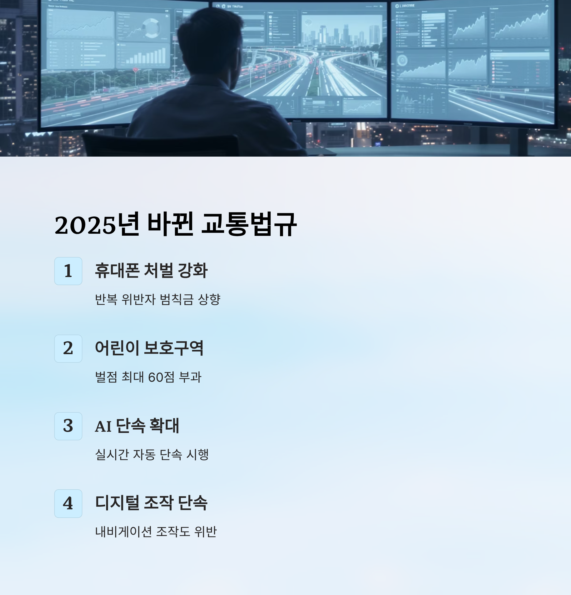 1️⃣ **휴대전화 사용 처벌 강화**: 반복 위반자에 대한 범칙금 상향 조정, 누적 위반 시 면허 정지 조치가 보다 빠르게 적용돼요.