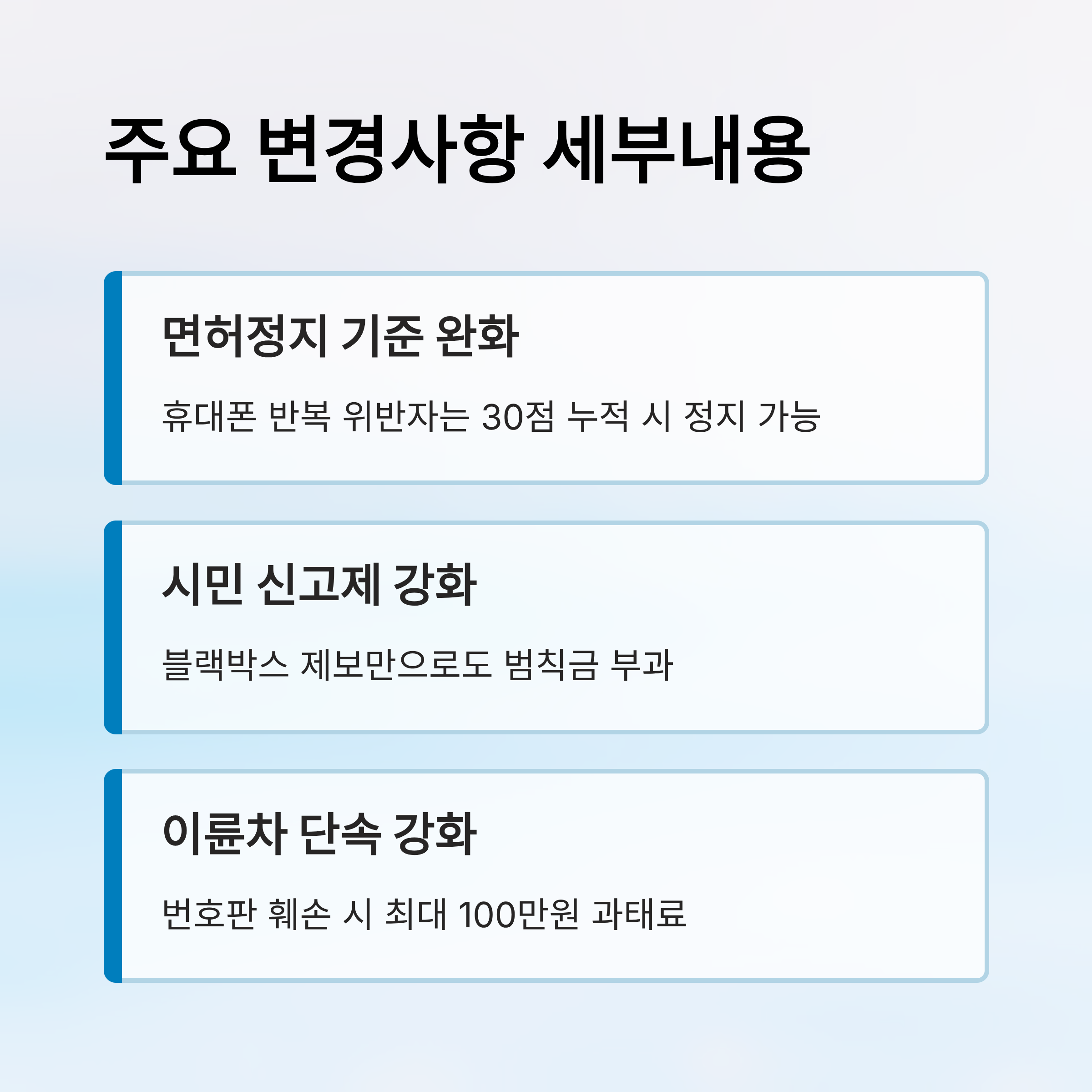 | 휴대전화 반복 위반 시 강화된 처벌 | 범칙금 상향, 면허 정지 기준 하향 |