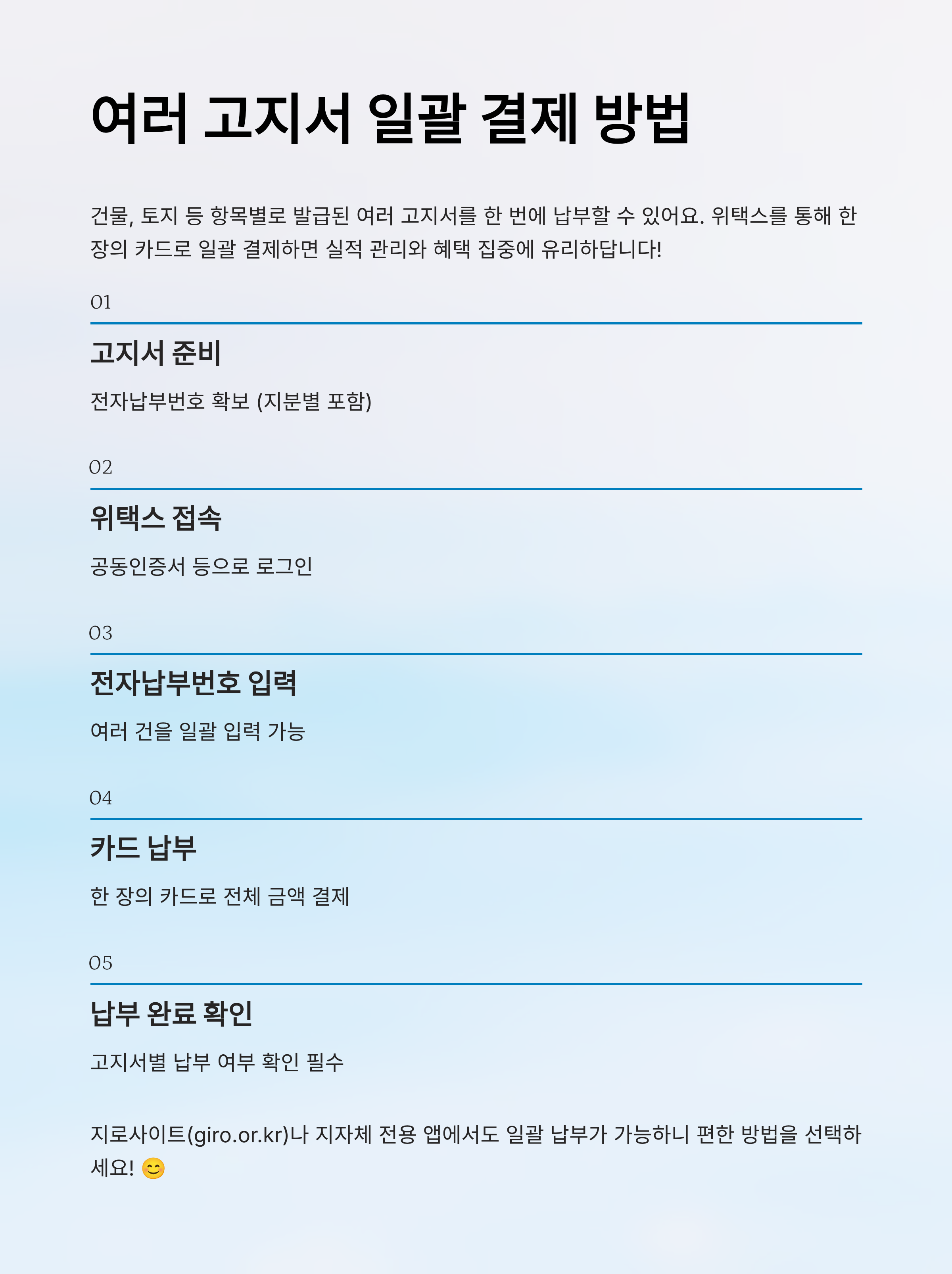 | ⑤ 납부 완료 확인 | 고지서별 납부 여부 확인 필수 |