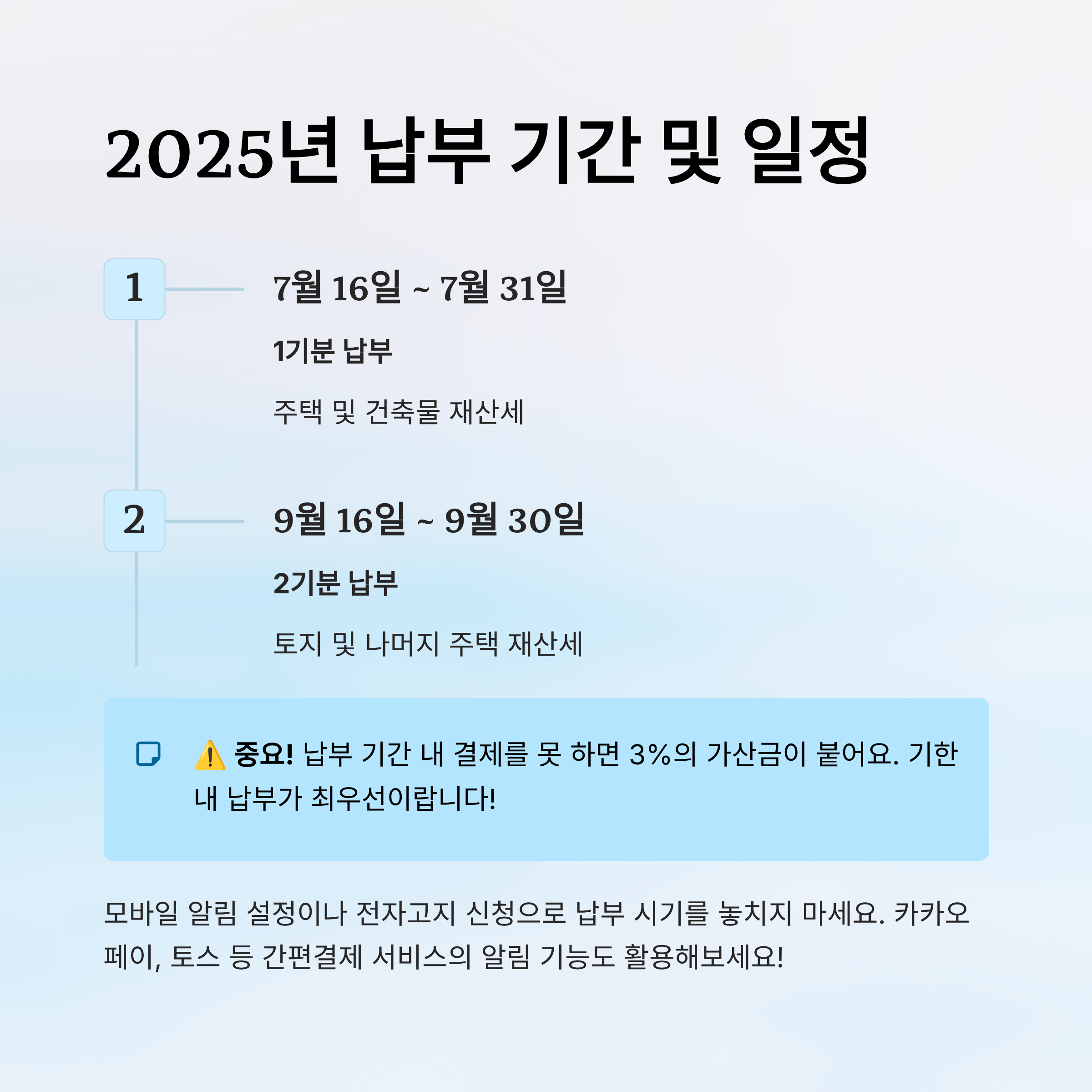 📌 2025 재산세 납부일정 요약: - 1기분 (주택/건물): 2025년 7월 16일 ~ 7월 31일 - 2기분 (토지/나머지 주택): 2025년 9월 16일 ~ 9월 30일 납부 기간 내 결제를 못 하면 3%의 가산금이 붙으니, 카드 혜택도 중요하지만 기한 내 납부가 가장 우선이에요!