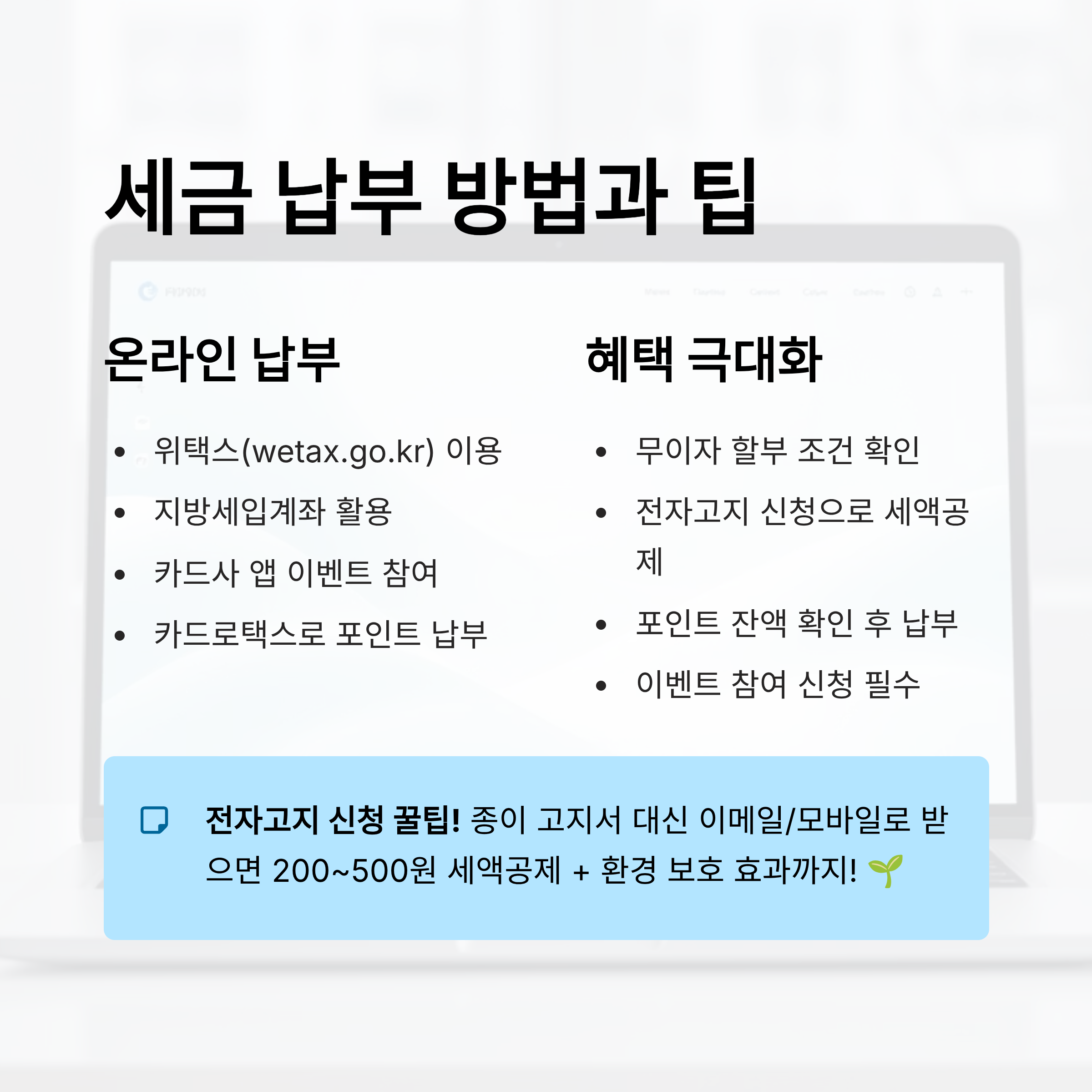 이처럼 납부 방법도 전략적으로 접근하면 혜택을 훨씬 더 많이 챙길 수 있어요. 특히 자동이체나 인터넷 지로 대신 ‘위택스’와 카드사 앱을 활용하면 이벤트 참여까지 쉽게 가능하니 꼭 활용해보세요! 😄