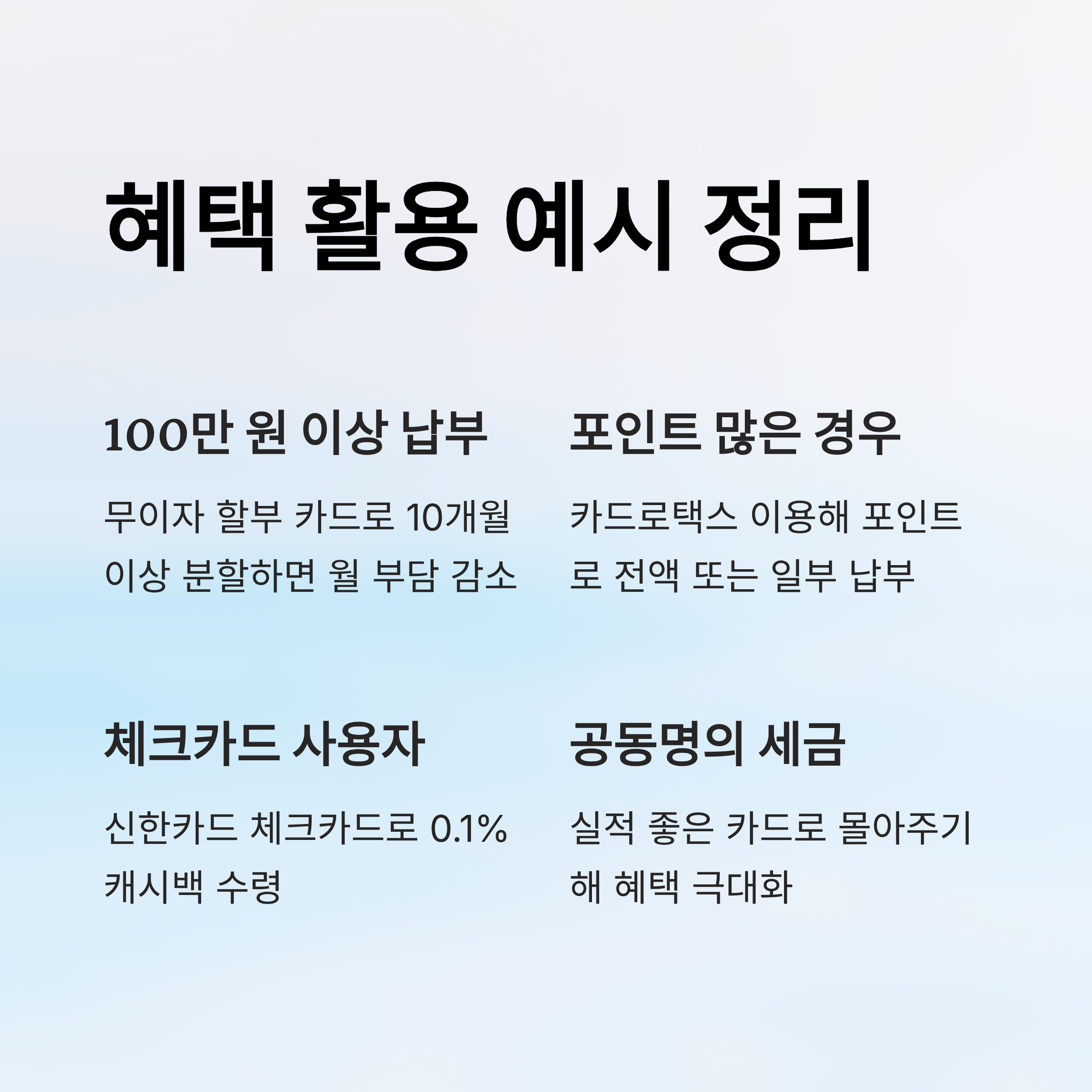 이 표처럼 혜택이 각기 다르기 때문에, 본인에게 가장 적합한 혜택을 중심으로 카드를 선택하는 것이 좋아요. 자주 쓰는 카드가 포인트가 많이 쌓여 있다면 포인트 납부를, 큰 금액을 부담 없이 나누고 싶다면 무이자 할부를 고르는 게 효과적이랍니다.😊