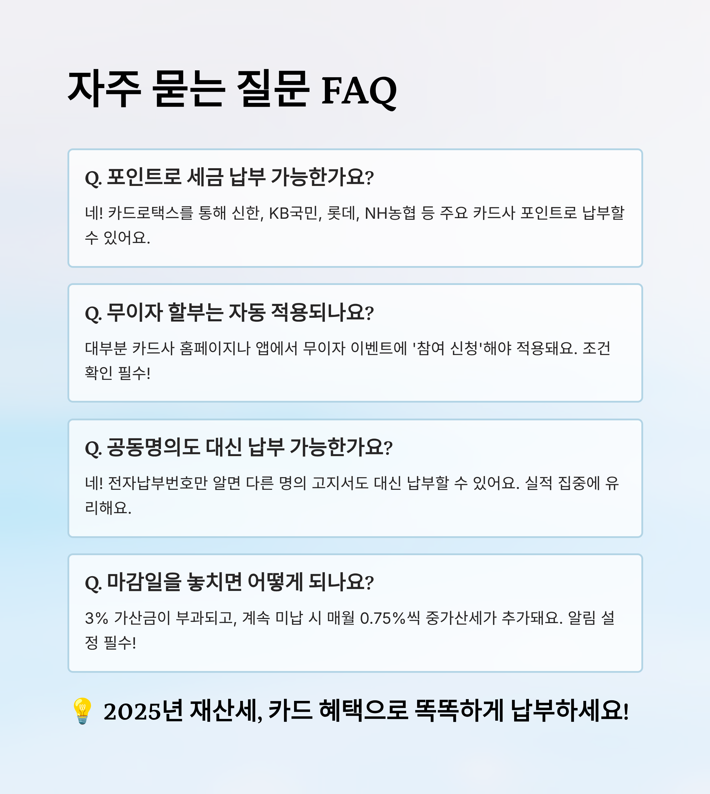 📌 이 콘텐츠는 2025년 9월 기준 정보를 바탕으로 작성되었으며, 카드사 및 지자체의 정책 변경에 따라 내용이 달라질 수 있어요. 실제 납부 전 반드시 해당 카드사 또는 관할 지자체 홈페이지를 통해 최신 정보를 확인해 주세요.