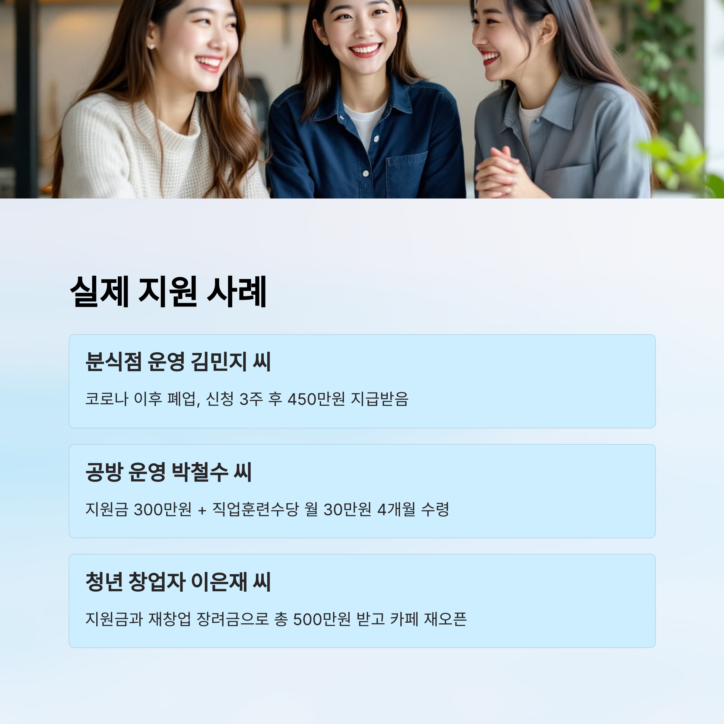 세 번째 사례는 조금 특이해요. 청년 창업자 이은재 씨는 지원금을 통해 재창업 교육을 받고, 그 교육을 바탕으로 2025년 2월에 다시 카페를 열었어요. 교육 수료와 컨설팅 후 ‘재창업 장려금’ 100만 원도 추가로 지급받았고요. 이처럼 다양한 방식으로 활용 가능하답니다!