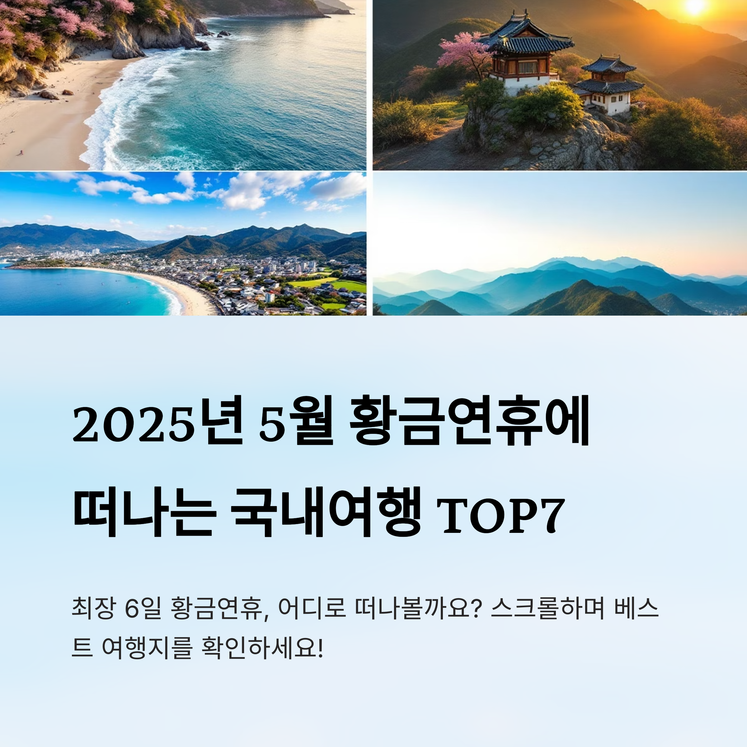 2025년 5월 황금연휴는 길게 쉴 수 있는 찬스예요! 봄의 절정을 즐기며 국내 곳곳의 아름다운 여행지를 찾는 사람들이 점점 늘어나고 있어요. 지금 소개하는 7곳은 연휴에 딱 맞는 여행지들이에요. 테마도 다양해서 연인, 친구, 가족 누구와 가도 좋아요. 😊