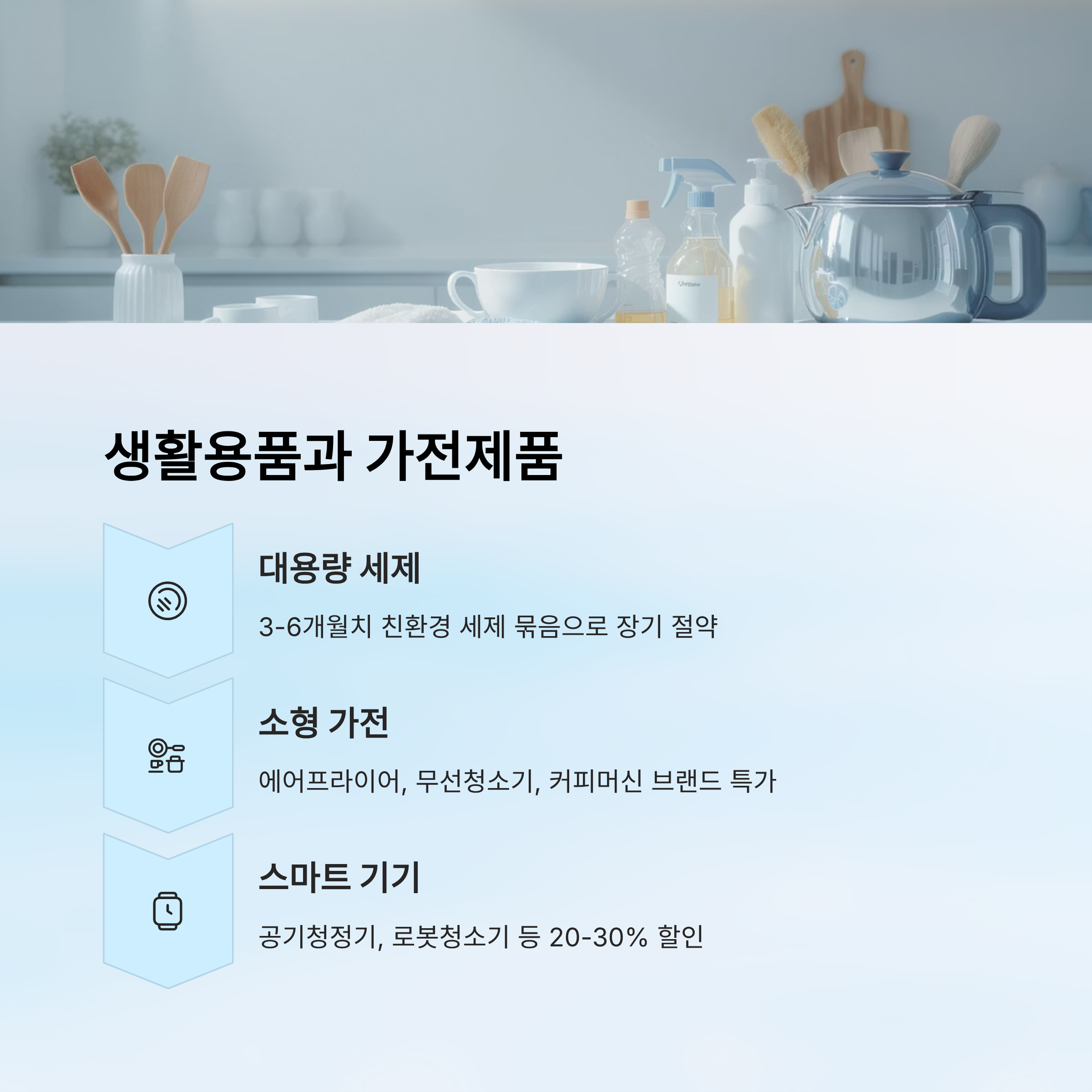 | 생활용품 | 세제, 키친웨어 | 15~35% | 대량 묶음 판매 |
