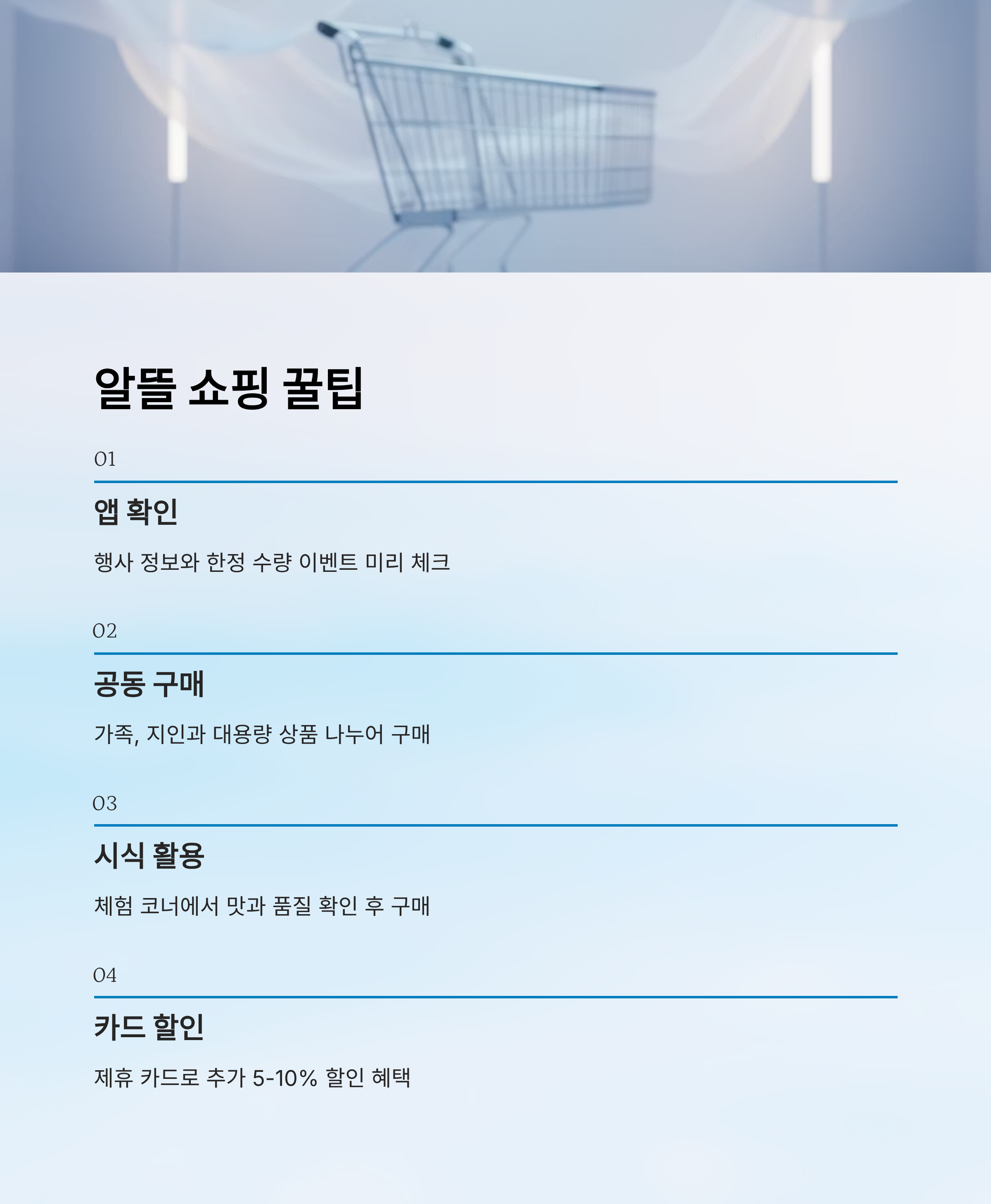 첫 번째 팁은 행사 리플렛과 모바일 앱 확인이에요. 행사 시작 전 트레이더스 앱이나 홈페이지에 접속하면 주간 할인 상품과 한정 수량 이벤트 정보를 미리 확인할 수 있어요. 이를 바탕으로 쇼핑 리스트를 작성하면 불필요한 지출을 줄이고 꼭 필요한 제품을 합리적으로 구입할 수 있어요.