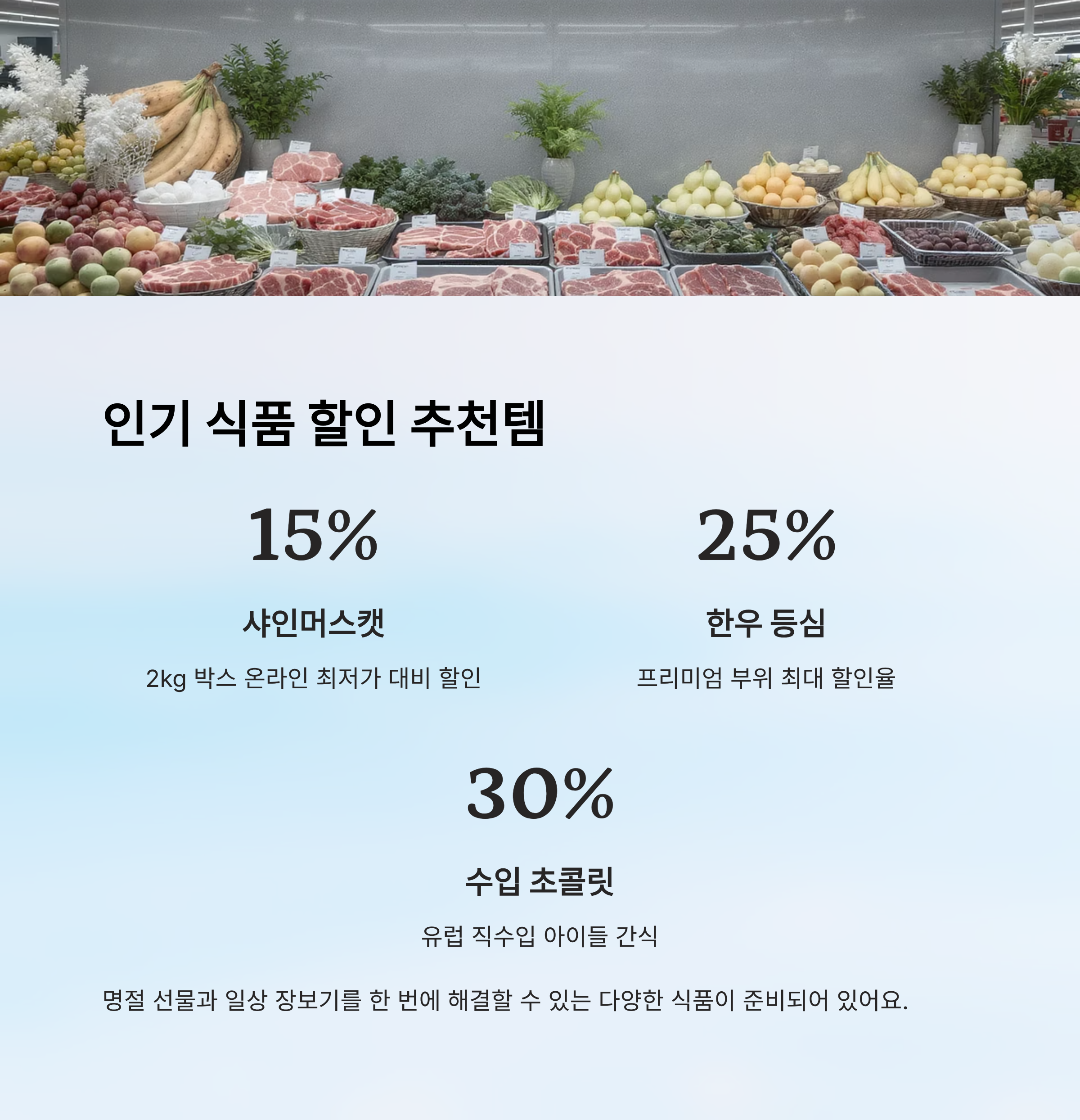 | 한우 등심 세트 | 프리미엄 부위 | 최대 25% | 명절 제수·선물용 |