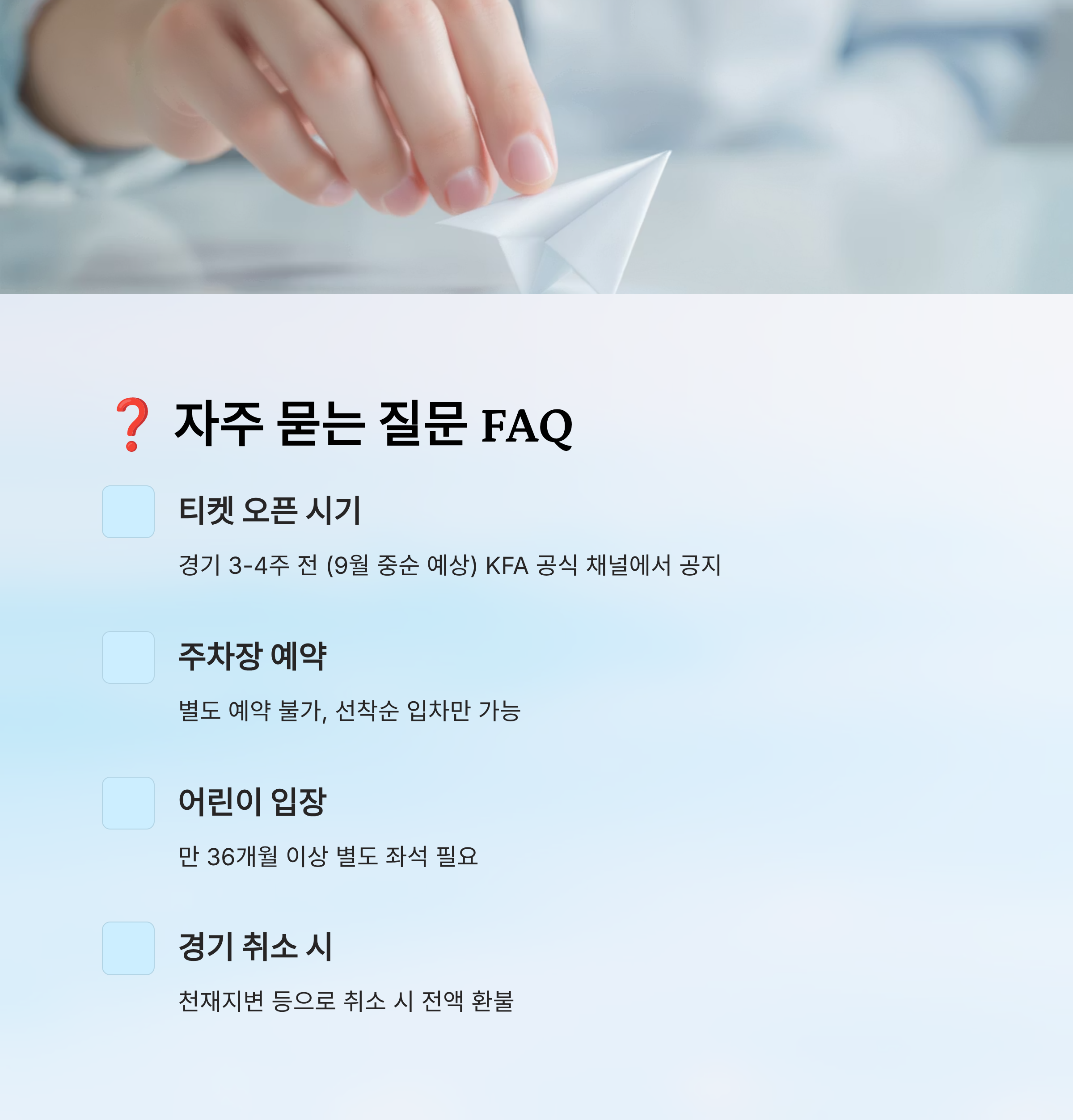 본 포스팅은 2025년 9월 기준 공개된 정보에 기반해 작성되었으며, 향후 KFA 또는 예매처의 정책, 경기 상황에 따라 내용이 달라질 수 있습니다. 공식 티켓 예매 일정, 정책, 입장 관련 사항은 KFA 공식 홈페이지 및 예매처 공지사항을 반드시 확인해주세요.