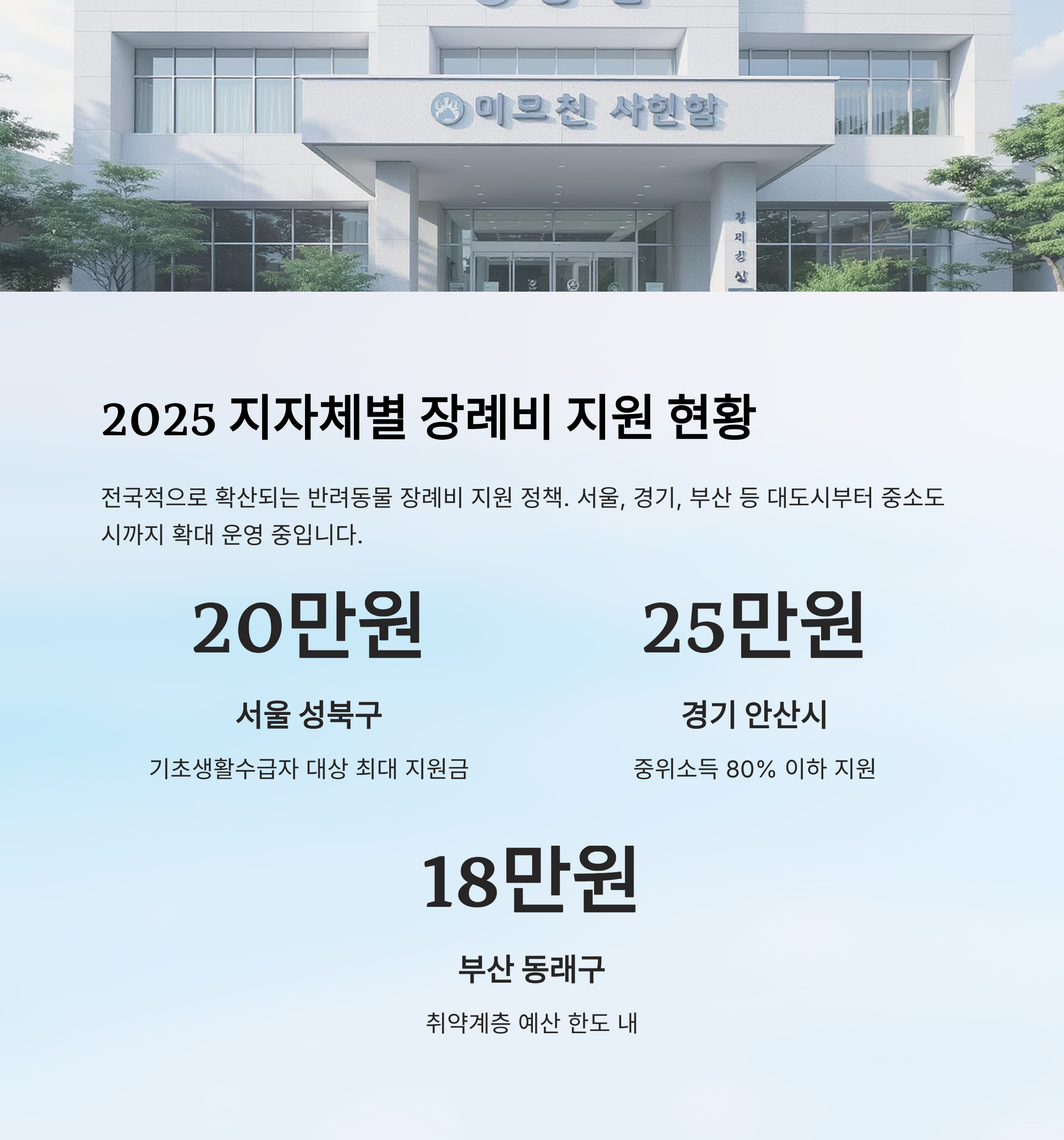 2025년 현재, 반려동물 장례비 지원 사업은 전국적으로 점점 더 확산되는 추세예요. 과거에는 몇몇 지자체만 시범적으로 운영하던 사업이 이제는 서울, 경기, 부산, 대전 등 대도시뿐 아니라 중소도시로까지 확대되고 있죠. 특히 일부 지자체는 아예 연간 예산을 별도로 편성해 상시 운영 중이에요.
