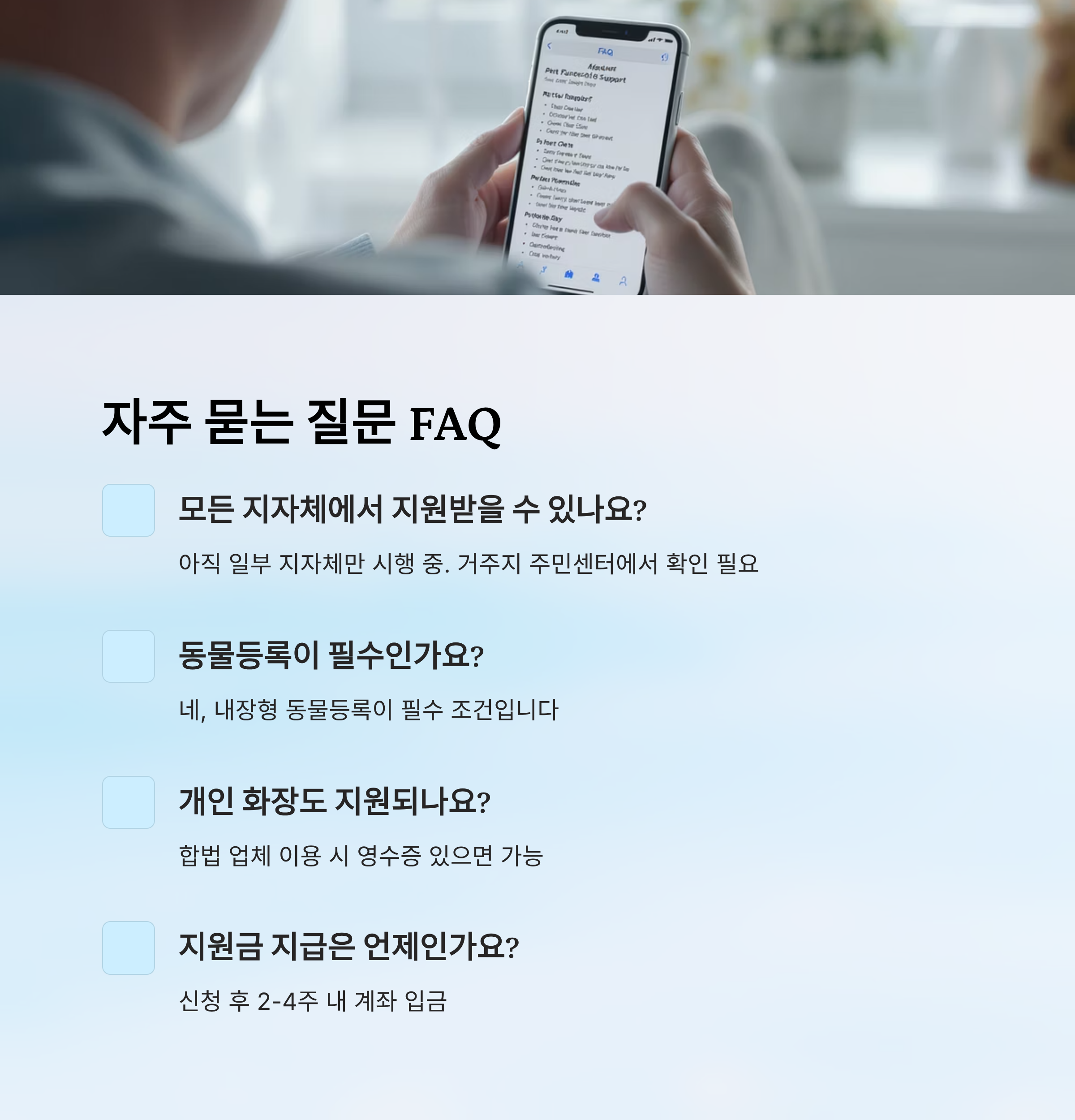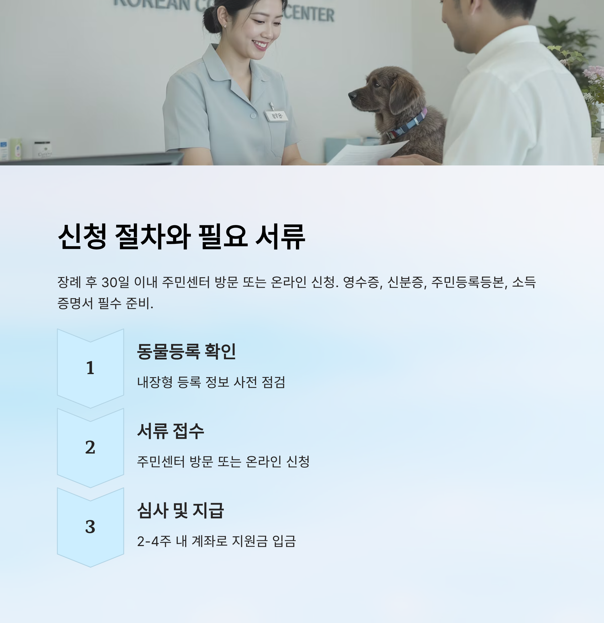그 외에 반드시 요구되는 서류는 신청인의 **신분증 사본**, **주민등록등본**, **소득 증명서**, 그리고 **반려동물 등록 정보**예요. 특히 내장형 동물등록 정보가 정부 시스템에 등록되어 있어야 하기 때문에, 사전에 확인하고 수정이 필요한 경우 동물병원을 통해 업데이트해두는 게 좋아요.