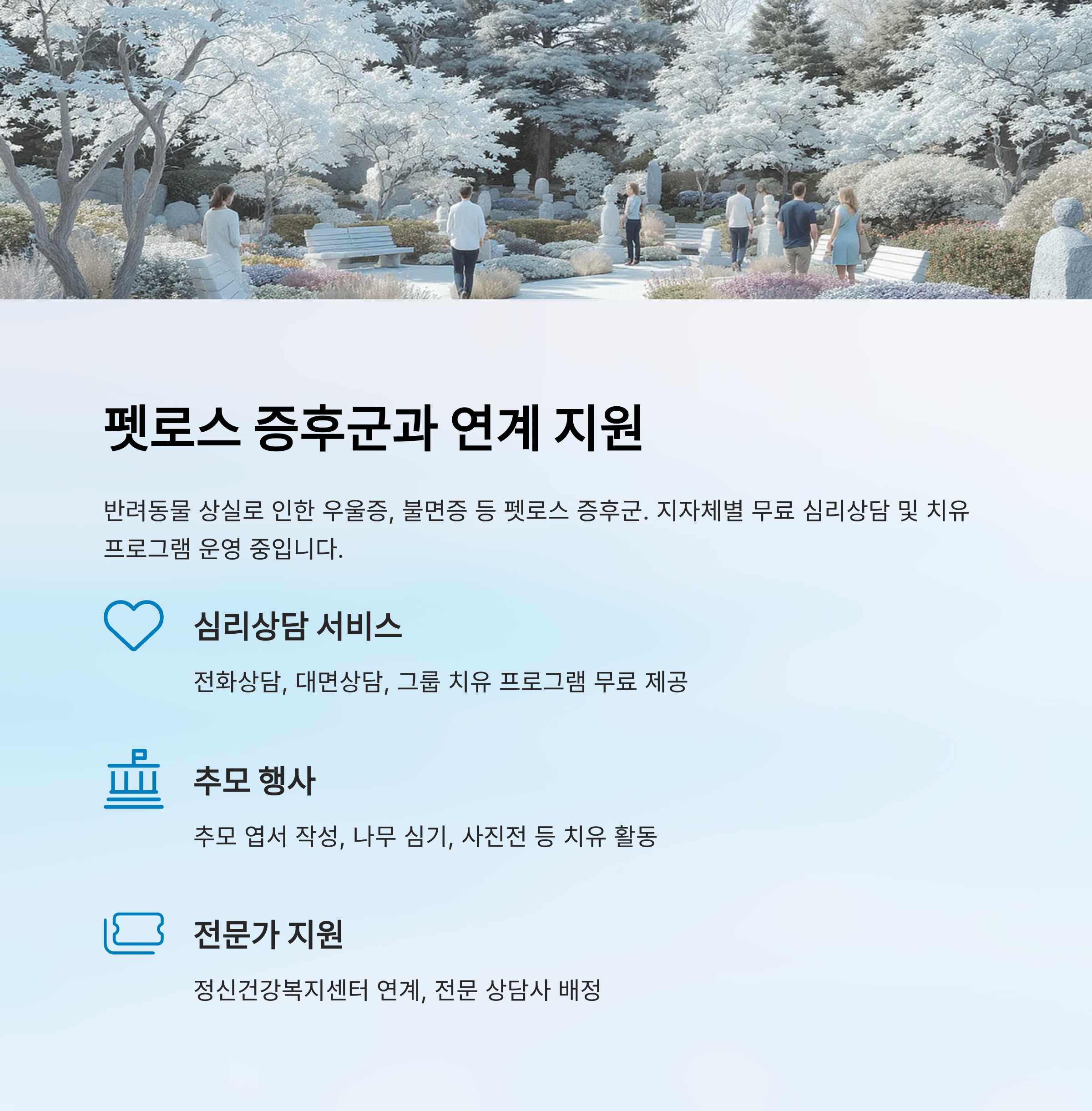 또한 일부 지자체는 장례비 지원과 함께 **추모 엽서 작성**, **추모 나무 심기**, **반려동물 추모 사진전**과 같은 치유 행사를 병행하기도 해요. 이런 행사는 슬픔을 표현하고 치유하는 데 큰 도움이 된다고 해요. 많은 보호자들이 "이런 시간이 없었다면 마음을 다잡지 못했을 것 같다"고 말할 정도로요. 🕊️