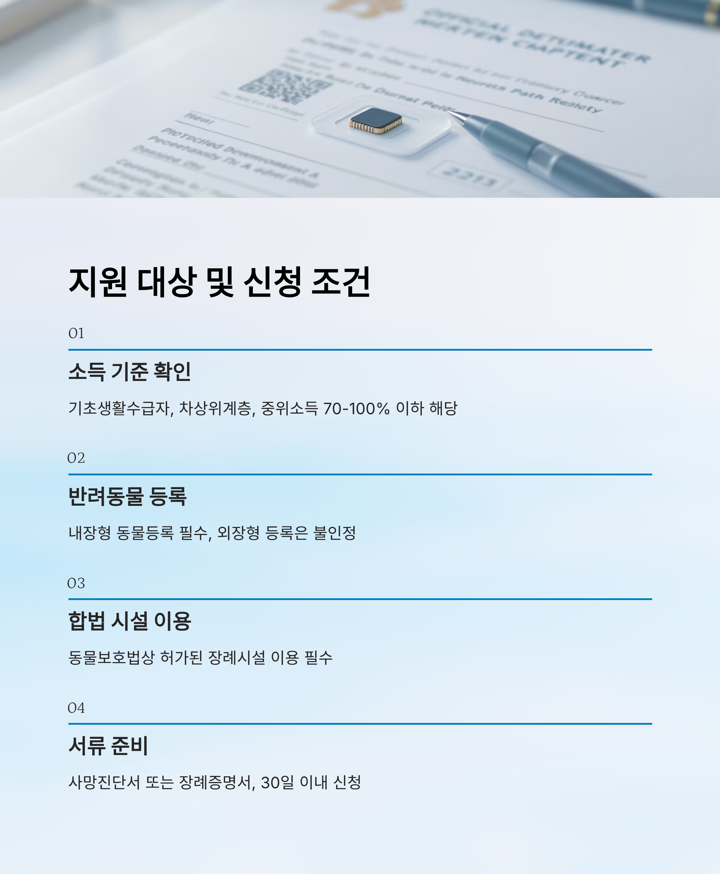 또한, 대부분의 지자체에서는 반려동물이 **내장형 등록**이 되어 있어야 하며, **합법적인 장례시설**을 이용해야만 지원이 가능해요. 일부 지역에서는 반려동물의 **사망 진단서** 혹은 **장례 증명서**를 첨부해야 하고, 장례 후 일정 기간 내에 신청해야 한다는 조건도 있으니 꼭 확인해야 해요.