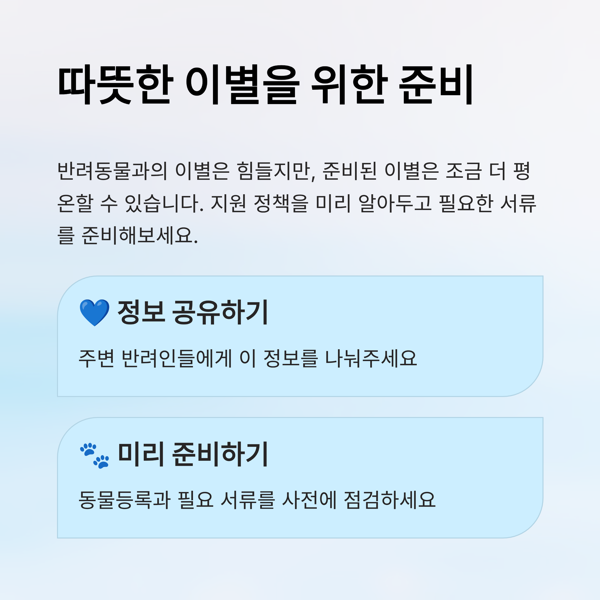 혹시 반려동물을 키우는 이웃이나 가족이 있다면, 이런 정보를 공유해주는 것도 큰 도움이 될 수 있어요. 주변의 누군가가 이런 정책을 몰라서 놓치는 일이 없도록 함께 알려보는 건 어떨까요? 😊