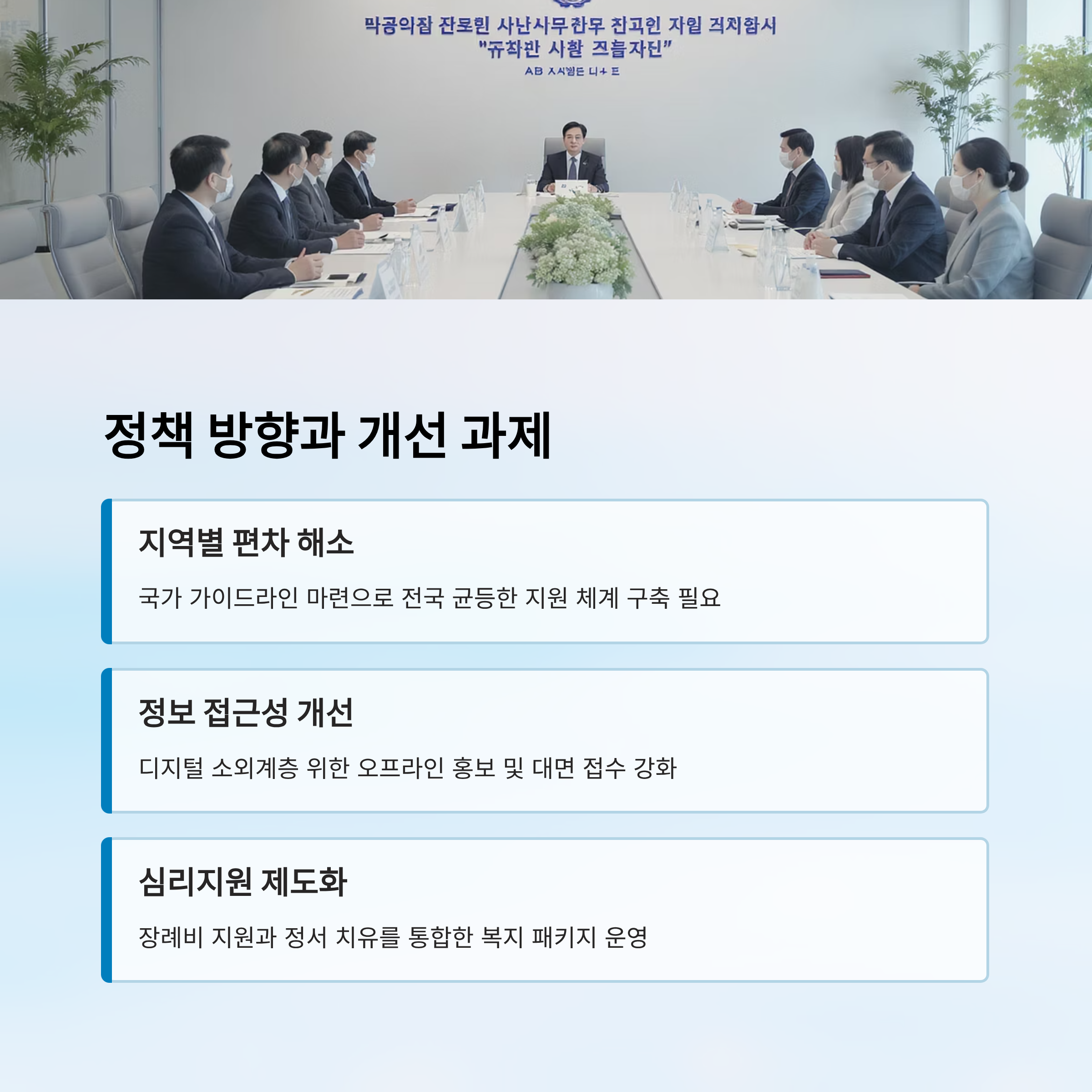2025년 현재 반려동물 장례비 지원 정책은 큰 진전을 이루었지만, 여전히 보완해야 할 점들이 많아요. 가장 큰 문제는 **지역별 편차**예요. 어떤 지자체는 다양한 서비스를 제공하는 반면, 일부 지역은 관련 제도가 전혀 없거나 예산이 너무 부족해 실질적인 지원이 어려운 상황이에요.