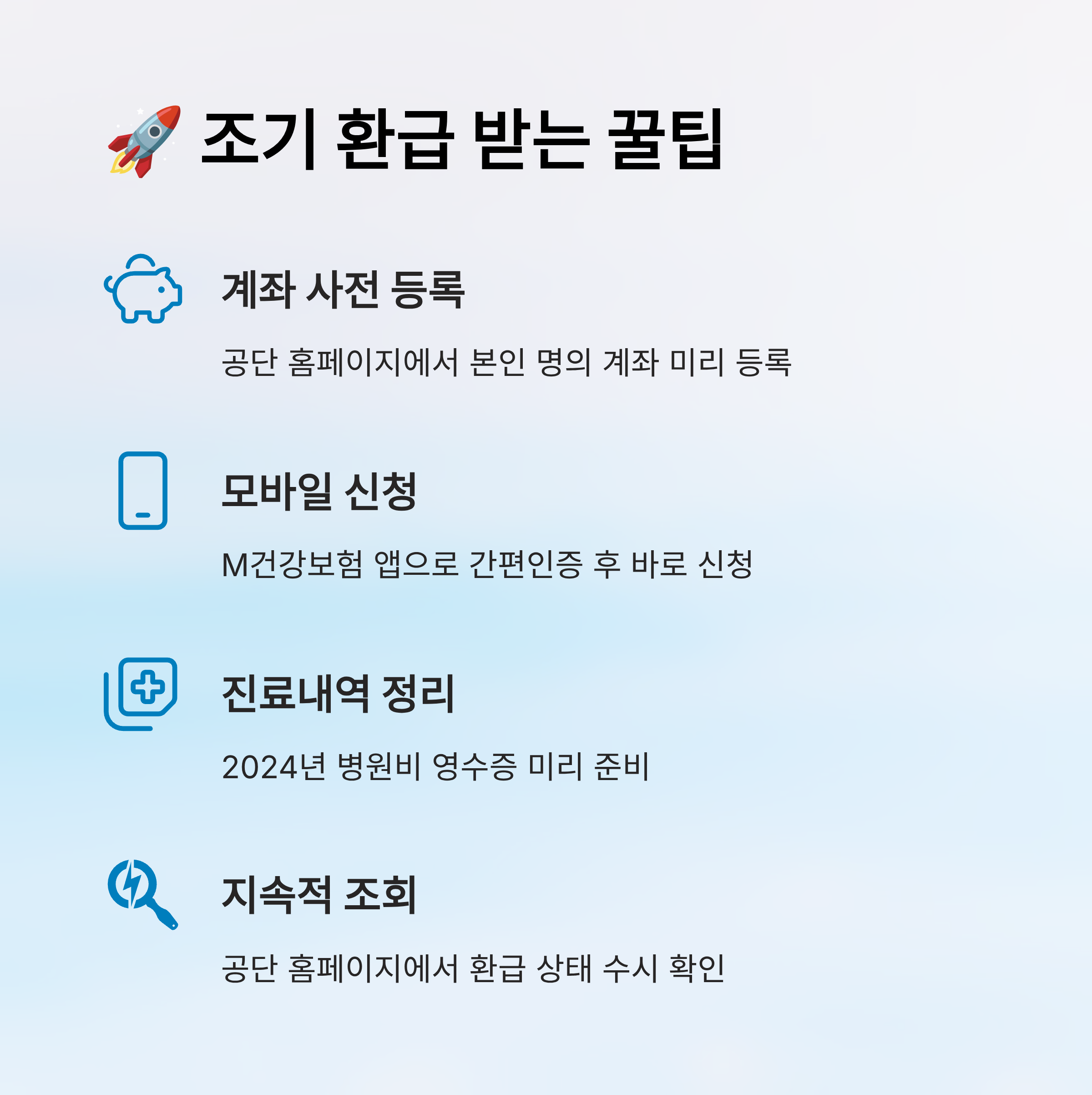 빠르게 환급받고 싶다면, 아래 방법들을 참고해보세요! 계좌 사전 등록은 필수고, 공단 앱 사용도 아주 효과적인 방법이에요. 요즘은 모바일 인증으로 대부분 절차가 빠르게 끝나기 때문에 서류 제출 없이 간편하게 처리 가능하거든요.