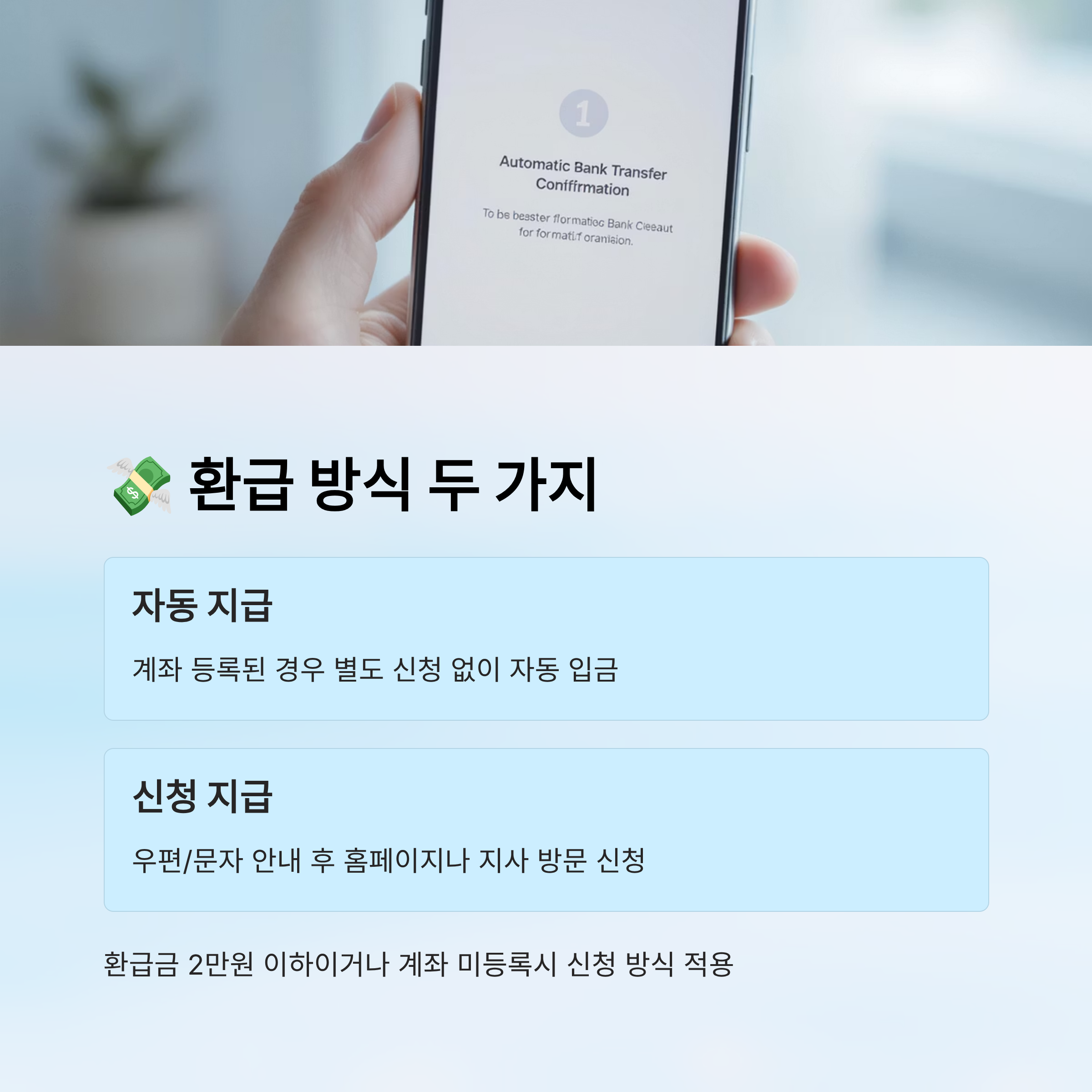 자동 지급은 2025년 9월 중순부터 시작되어 빠르면 문자나 알림도 없이 통장에 돈이 들어와 있는 경우도 있어요. 반면 신청 지급 대상자는 우편이나 문자로 '환급 대상자 안내'를 받은 후 공단 홈페이지나 가까운 지사에 방문해 신청해야 해요.