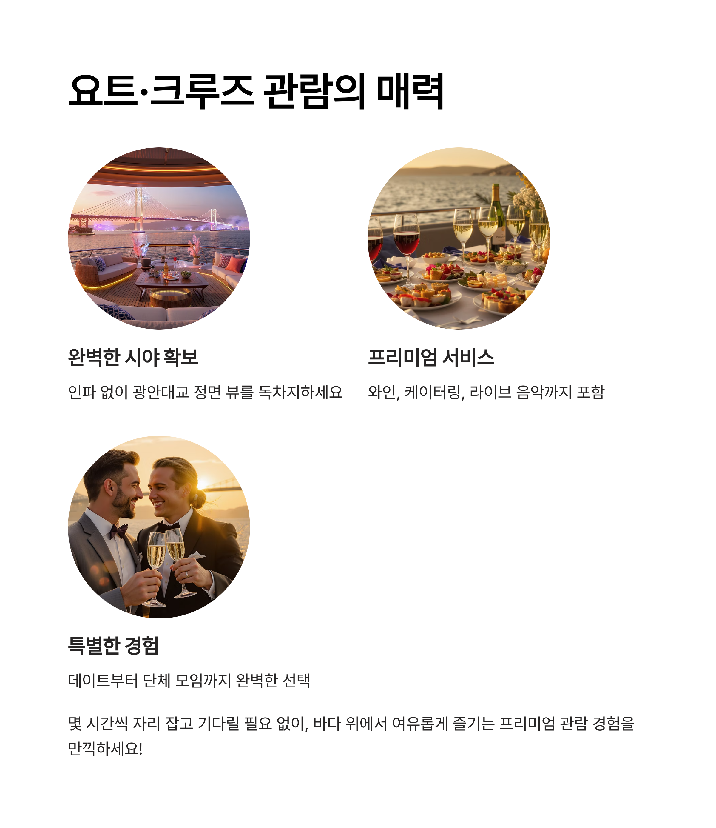 | 럭셔리 요트 VIP | 케이터링+샴페인 | 광안대교 정면 | ₩150,000 |