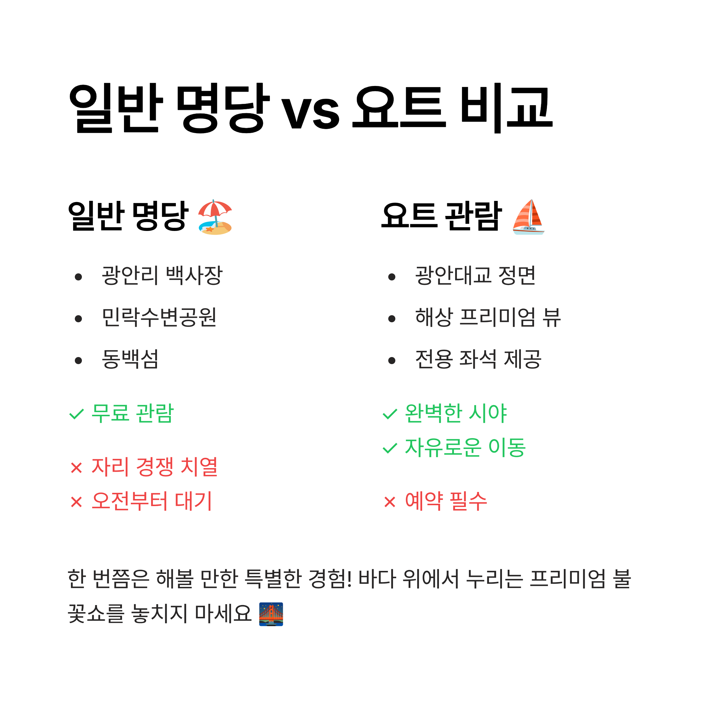 요트나 크루즈 관람의 가장 큰 장점은 뭐니 뭐니 해도 "시야 확보"예요. 인파에 치이지 않고, 여유롭게 바다 위에서 광안대교와 불꽃을 정면으로 볼 수 있어요. 자리를 위해 몇 시간씩 기다릴 필요도 없고요.